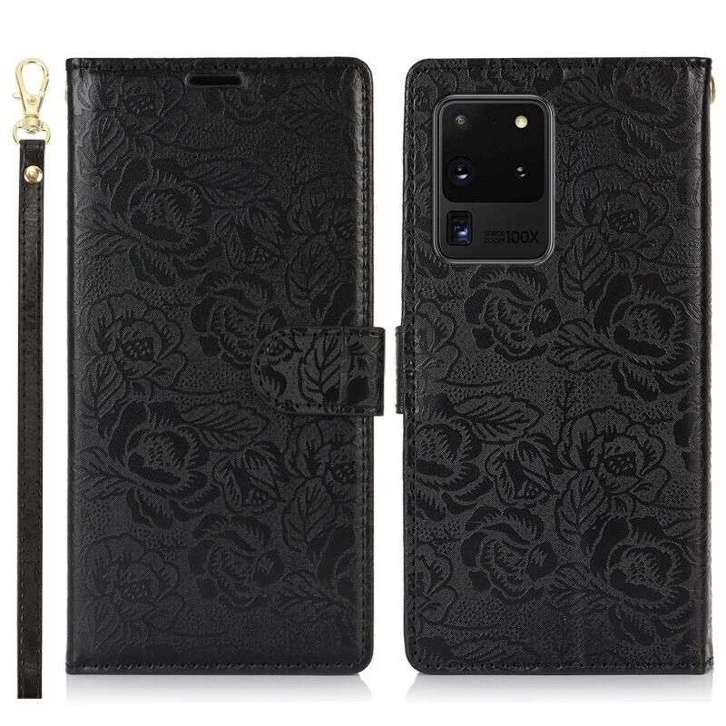 Θήκη τηλεφώνου Samsung Galaxy S20 Ultra με δερμάτινη εκτύπωση λουλουδιών παιωνίας (Μαύρο)