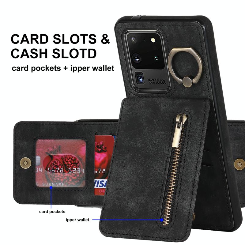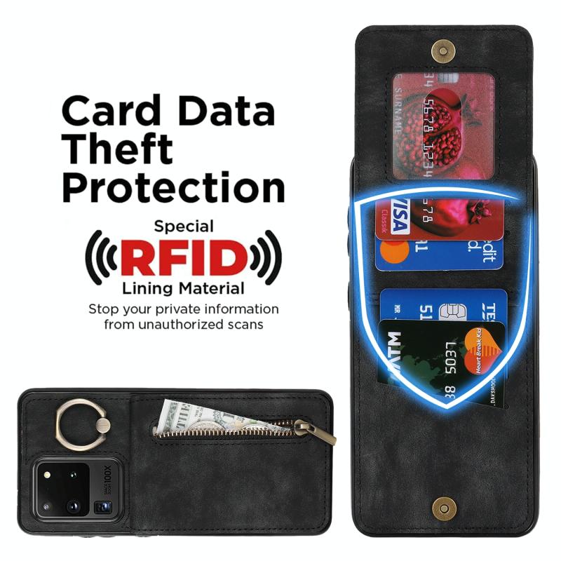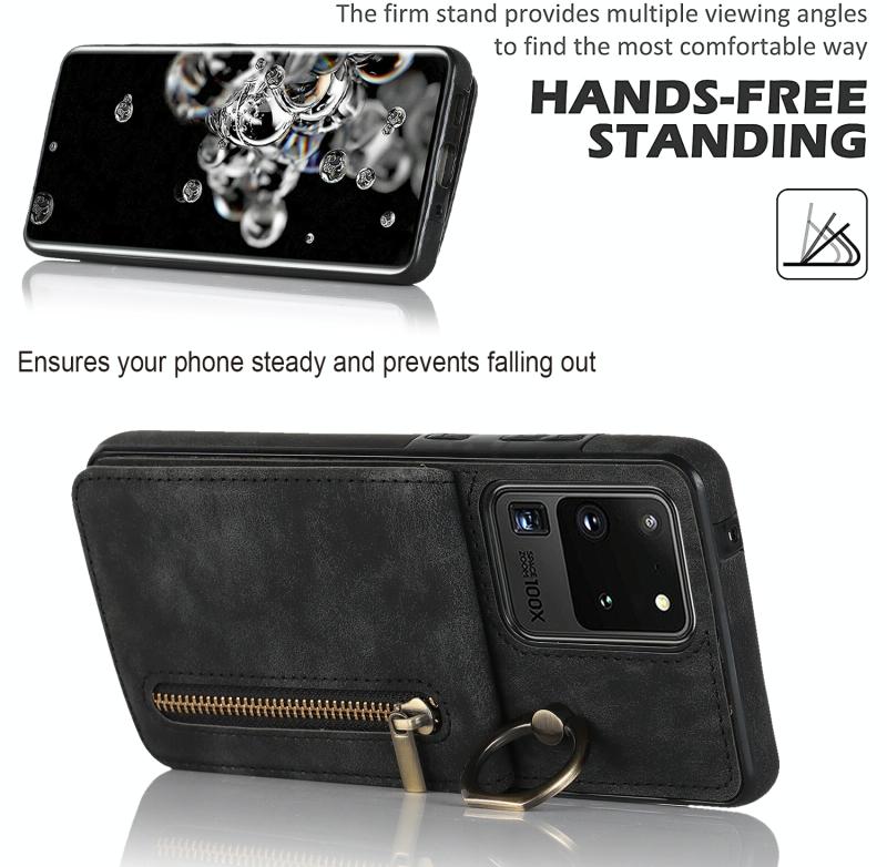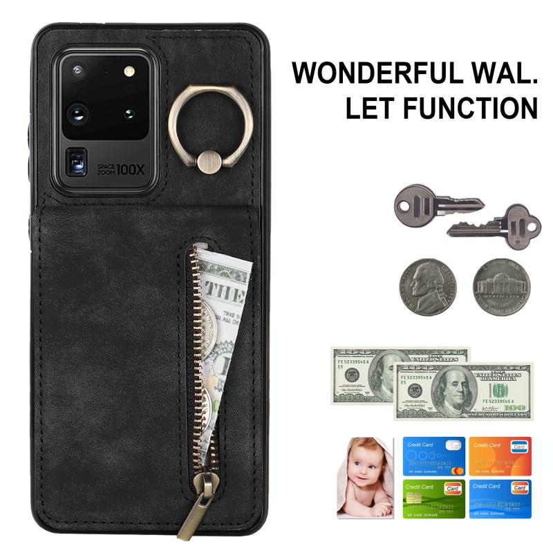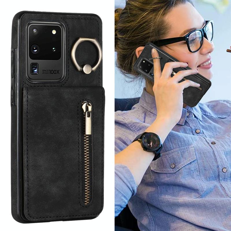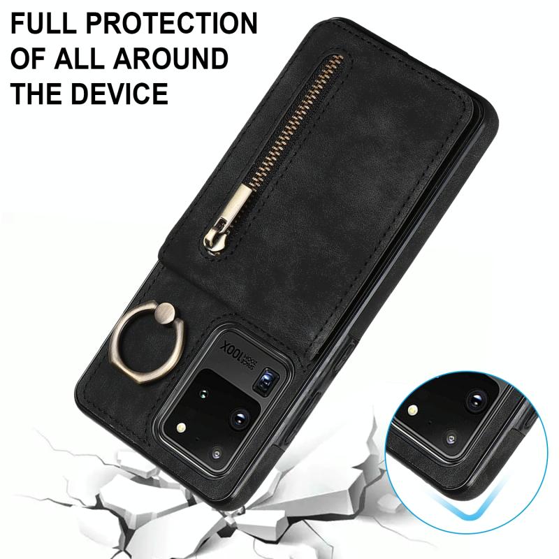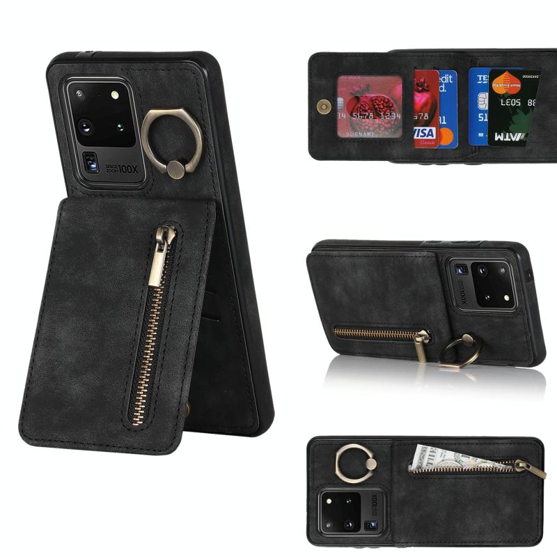 Θήκη κινητού τηλεφώνου Samsung Galaxy S20 Ultra Retro με δακτύλιο και θήκη καρτών RFID με φερμουάρ (Μαύρο)