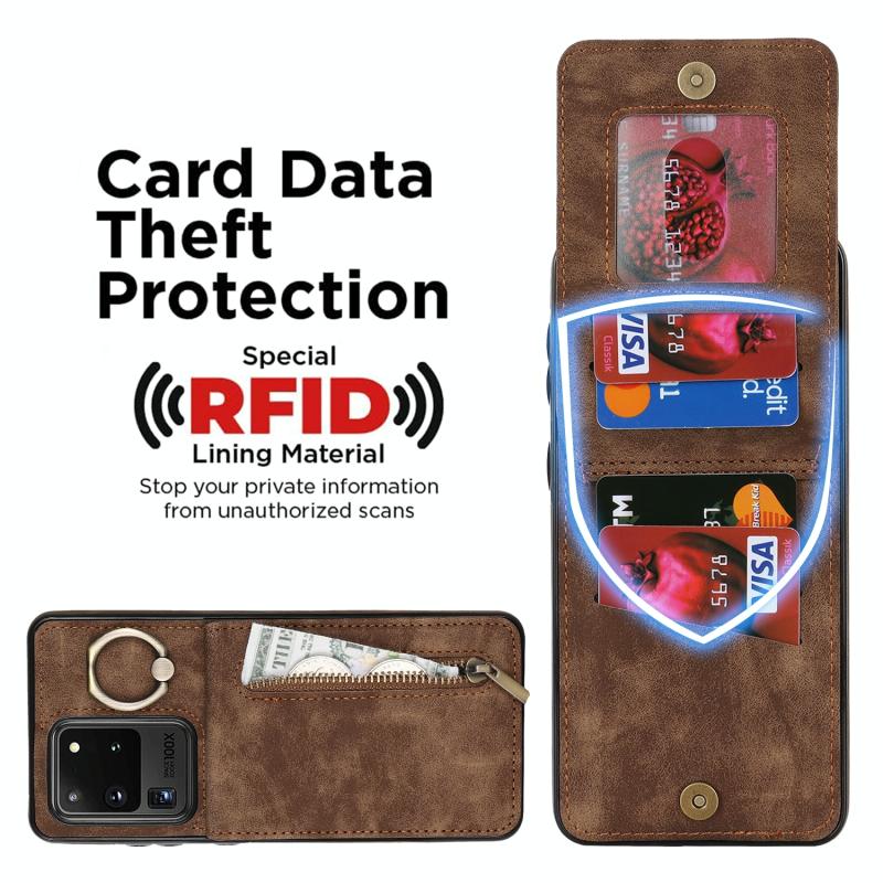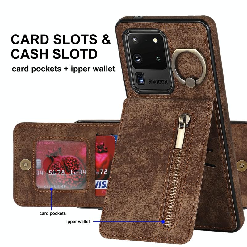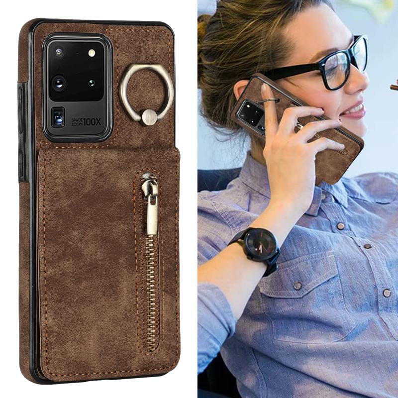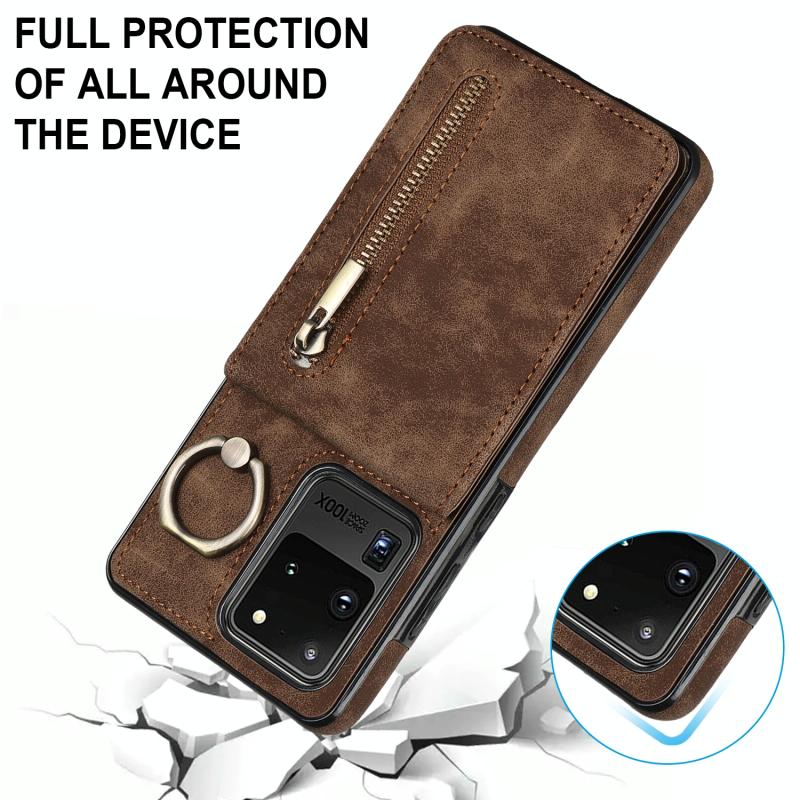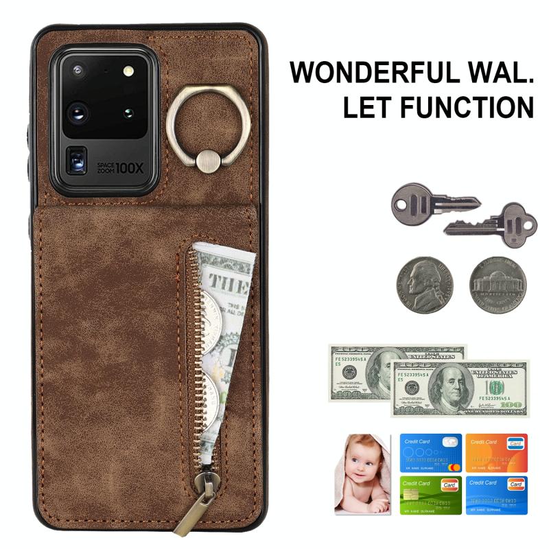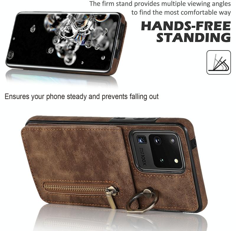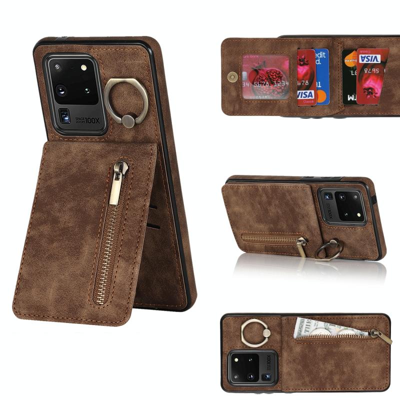 Θήκη κινητού τηλεφώνου Samsung Galaxy S20 Ultra Retro με δακτύλιο και θήκη καρτών RFID με φερμουάρ (Καφέ)