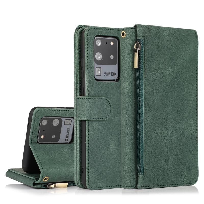 Για Samsung Galaxy S20 Ultra Skin-feel Crazy Horse υφή φερμουάρ τσάντα πορτοφόλι οριζόντια Flip δερμάτινη θήκη με κάτοχο & υποδοχές για κάρτες & πορτοφόλι & Lanyard (σκούρο πράσινο)