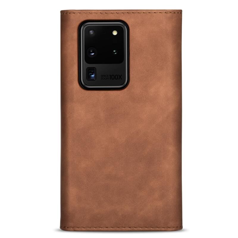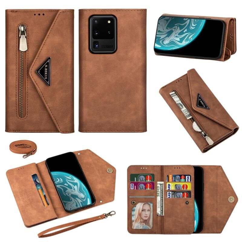 Θήκη Samsung Galaxy S20 Ultra με αίσθηση δέρματος, οριζόντια, με φερμουάρ, με θήκη, υποδοχές καρτών, κορνίζα φωτογραφιών, κορδόνι και μακρύ σχοινί (Καφέ)