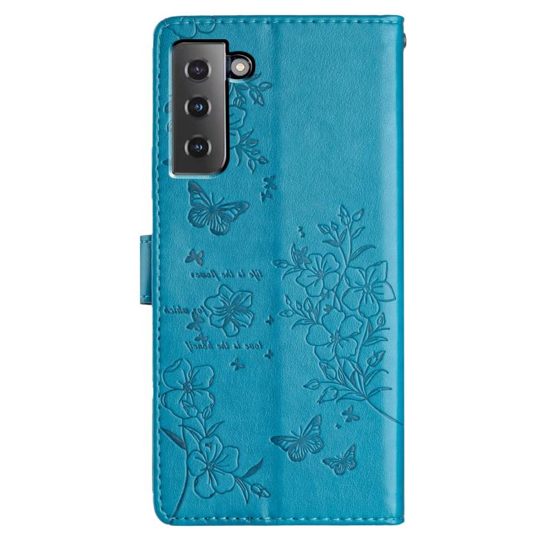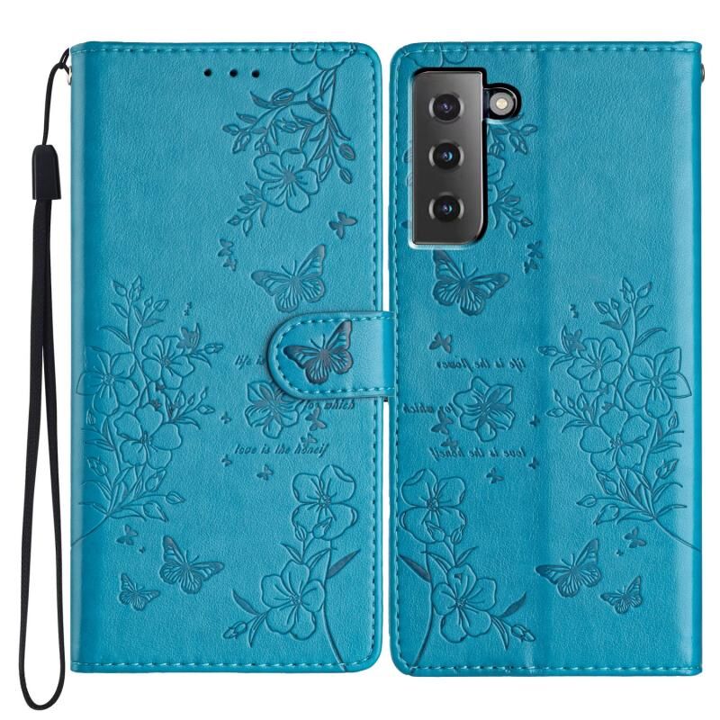 For Samsung Galaxy S21 5G Butterflies and Flowers Leather Phone Case(Blue)