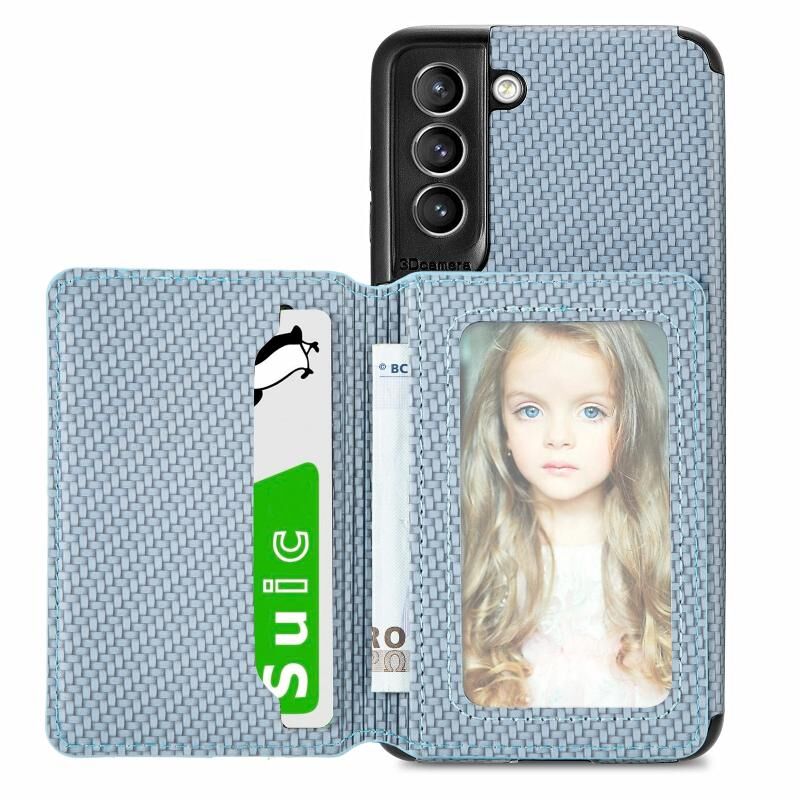 Για Samsung Galaxy S21+ 5G Carbon Fiber Μαγνητική τσάντα κάρτα TPU + PU Shockproof πίσω κάλυμμα υπόθεση με θήκη & υποδοχή κάρτας & πλαίσιο φωτογραφιών (μπλε)