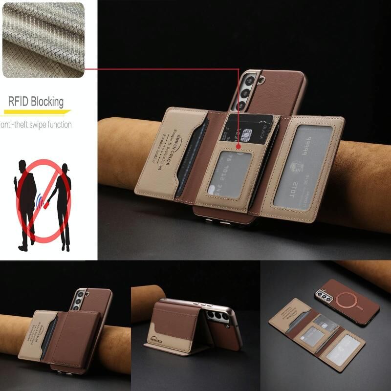 2. Magnetic Tri-Fold Wallet Design: Features a horizontal fold with a strong magnetic closure for easy access and secure storage.