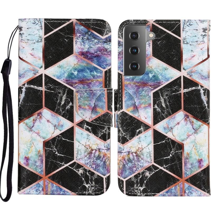 Θήκη Samsung Galaxy S21 5G με πολύχρωμο σχέδιο, οριζόντια αναδιπλούμενη από δερματίνη PU με βάση στήριξης, θήκες για κάρτες, πορτοφόλι & λουρί (Μαύρο Μάρμαρο)