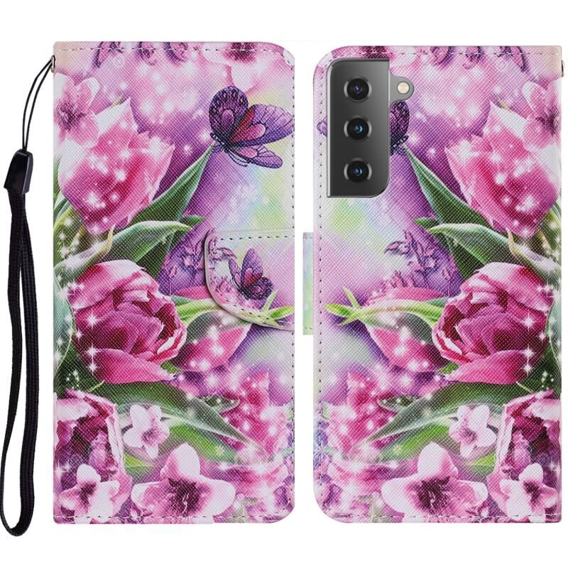Θήκη Samsung Galaxy S21+ 5G με πολύχρωμο σχέδιο, οριζόντια αναδιπλούμενη από δερματίνη PU με βάση στήριξης, θήκες για κάρτες, πορτοφόλι & λουρί (Ροζ Πεταλούδα)