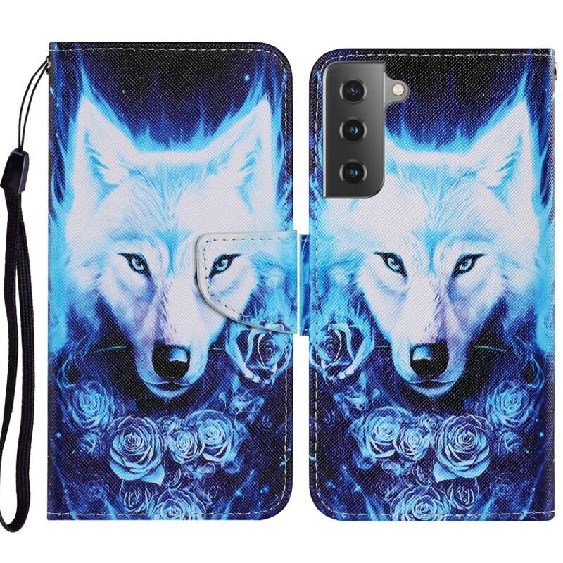 Θήκη Samsung Galaxy S21 5G με σχέδιο πολύχρωμης ζωγραφικής, οριζόντια, από δερματίνη PU με βάση στήριξης & θήκες για κάρτες & πορτοφόλι & κορδόνι (Rose Wolf)