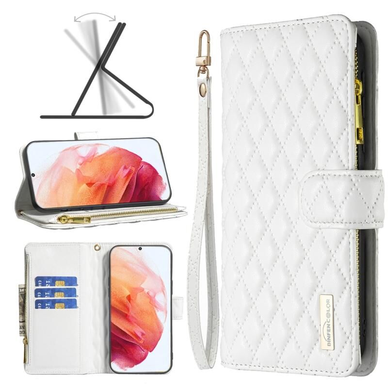 Θήκη τηλεφώνου Samsung Galaxy S21 5G, Δερμάτινη θήκη τύπου πορτοφολιού με φερμουάρ και σχέδιο διαμαντόπετρας (Λευκό)