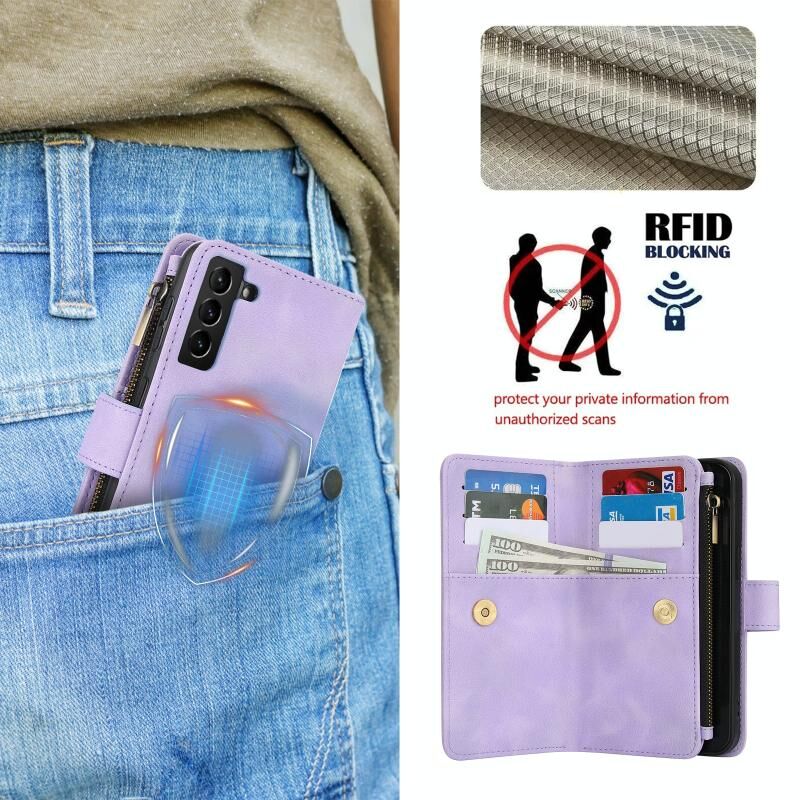 Για Samsung Galaxy S21 + 5G Dream 9-Card φερμουάρ πορτοφόλι RFID δερμάτινη θήκη τηλεφώνου με κορδόνι (μωβ)