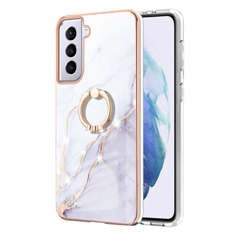 For Samsung Galaxy S21+ 5G Electroplating Marble Pattern IMD TPU Shockproof Case with Ring Holder(White 006)