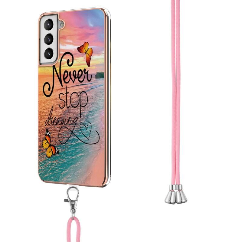 Θήκη προστασίας για Samsung Galaxy S21+ 5G με σχέδιο επιμετάλλωσης IMD TPU, ανθεκτική σε κρούσεις, με κορδόνι λαιμού (Πεταλούδα που κυνηγάει όνειρα)