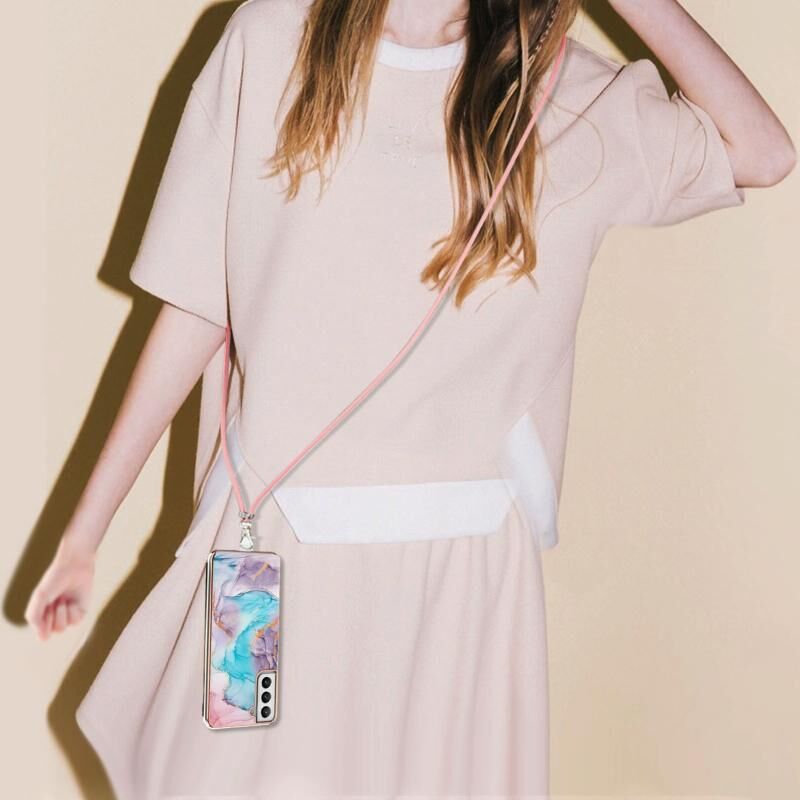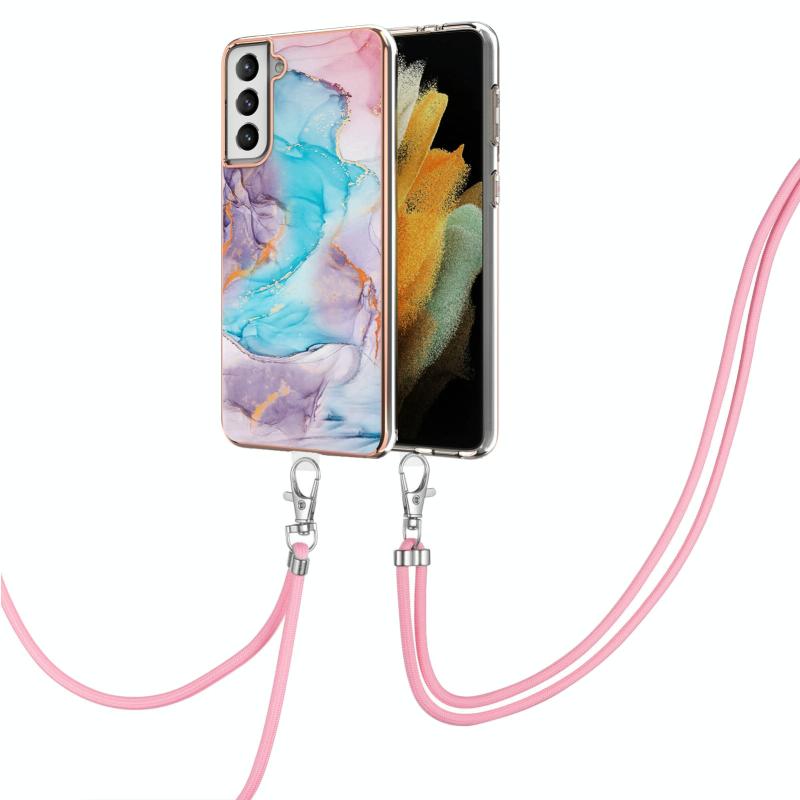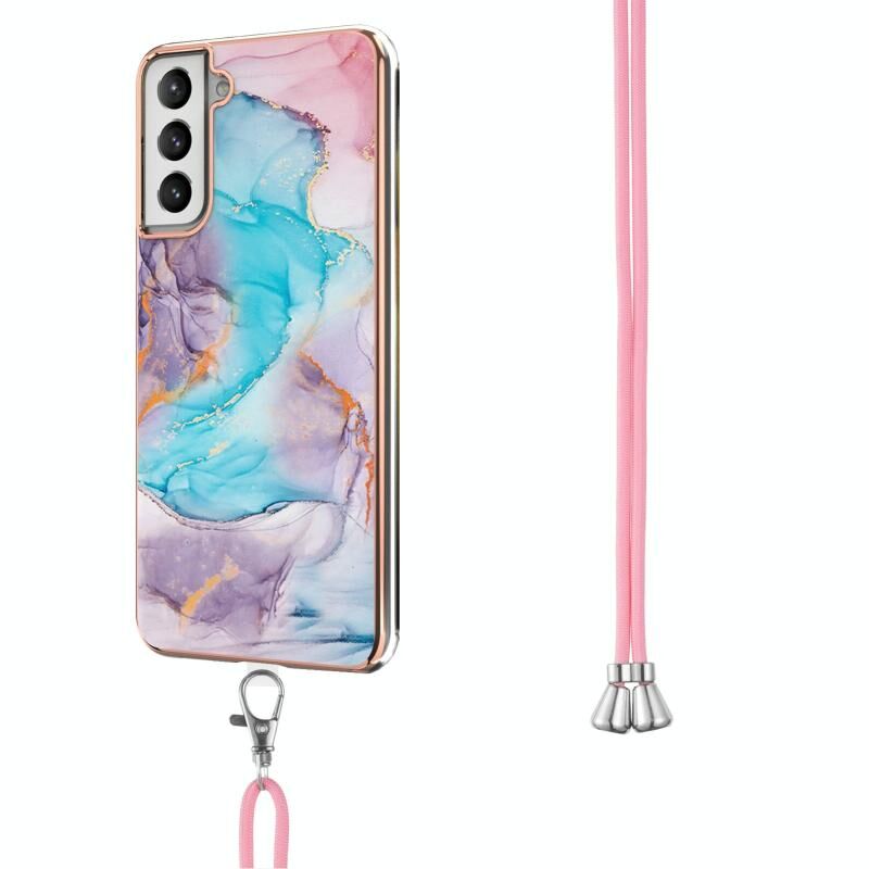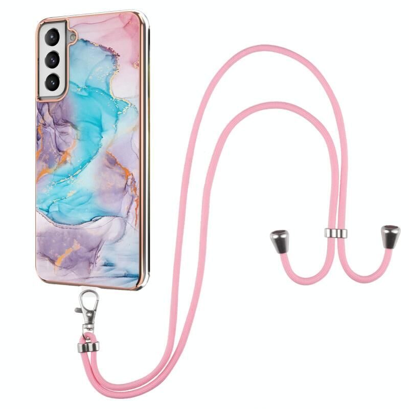 Θήκη προστασίας για Samsung Galaxy S21+ 5G με σχέδιο επιμετάλλωσης IMD, από TPU ανθεκτικό σε κρούσεις, με κορδόνι λαιμού (Μωβ Λουλούδι)