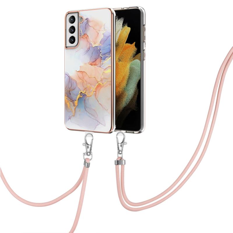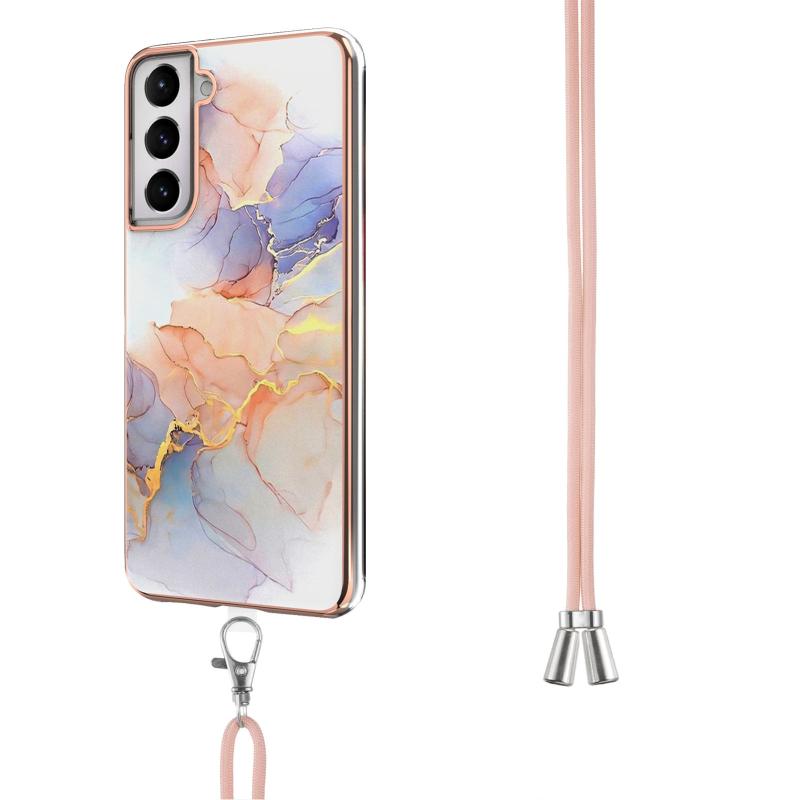 Θήκη προστασίας για Samsung Galaxy S21+ 5G με σχέδιο επιμετάλλωσης IMD, από TPU ανθεκτικό σε κρούσεις, με κορδόνι λαιμού (Μωβ Λουλούδι)
