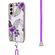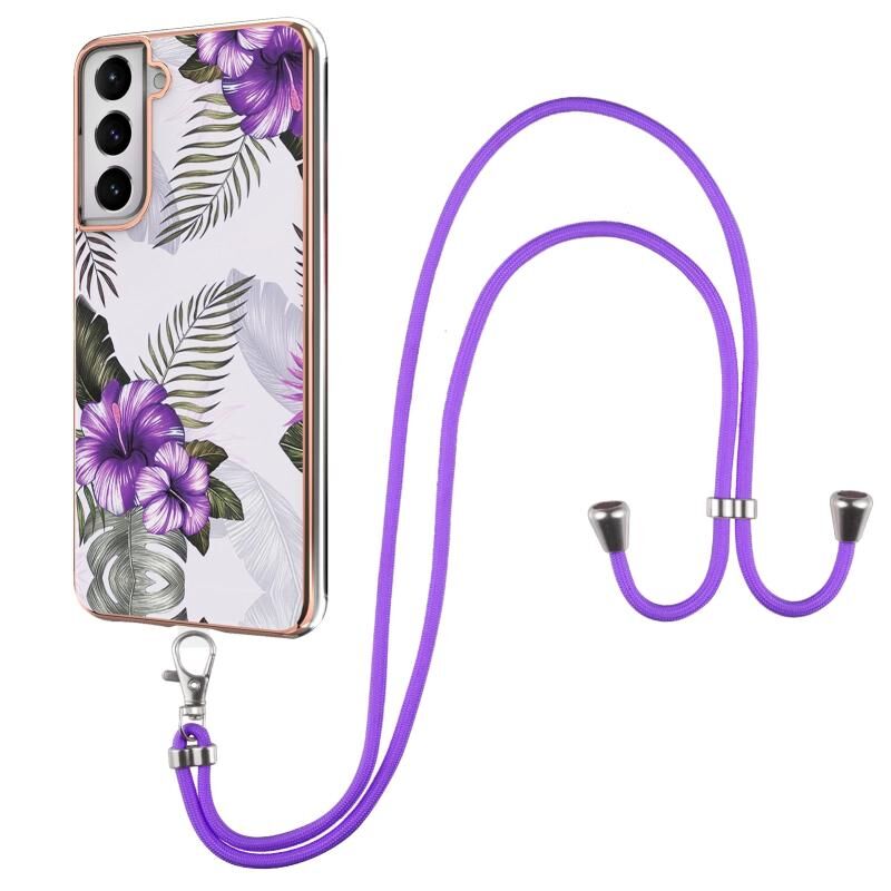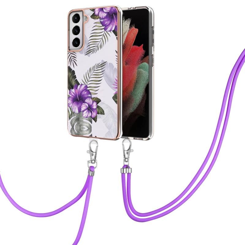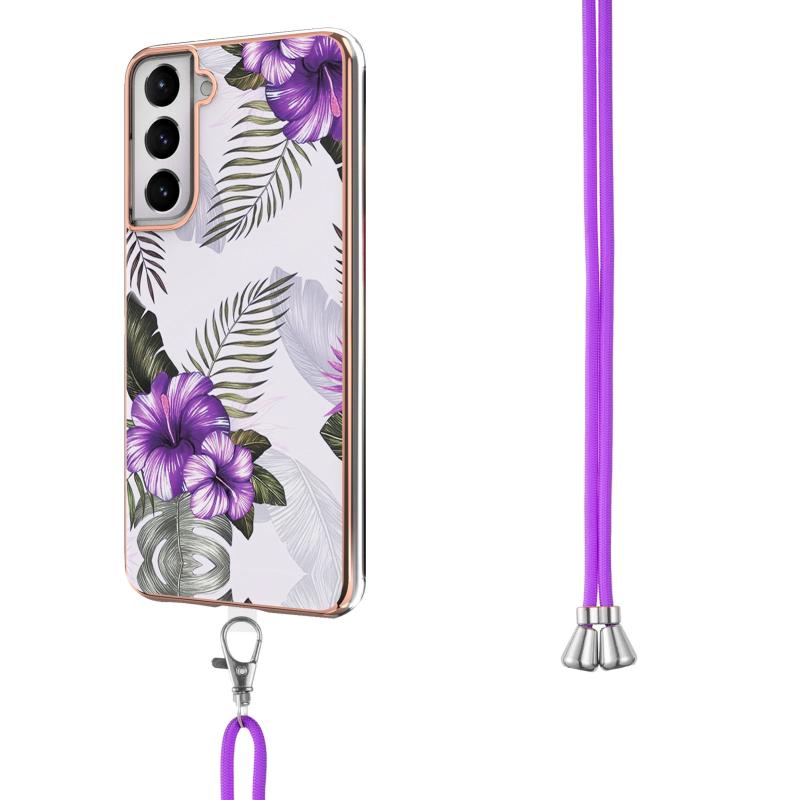 For Samsung Galaxy S21 5G Electroplating Pattern IMD TPU Shockproof Case with Neck Lanyard(Purple Flower)