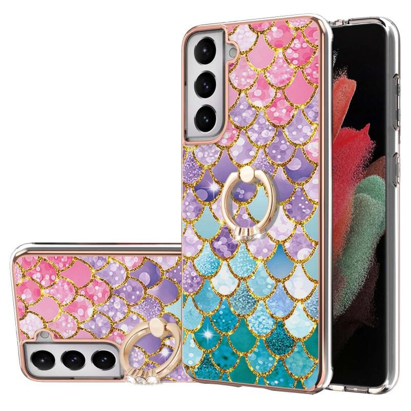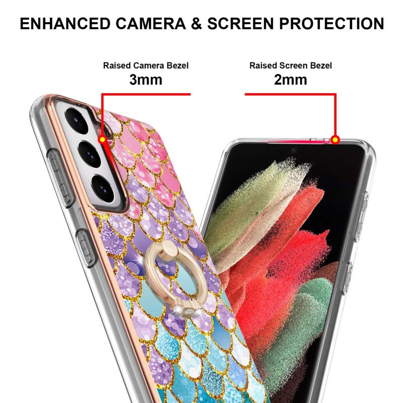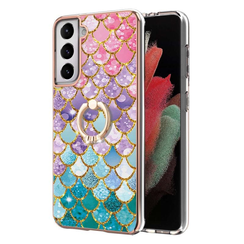 For Samsung Galaxy S21 5G Electroplating Pattern IMD TPU Shockproof Case with Rhinestone Ring Holder(Colorful Scales)