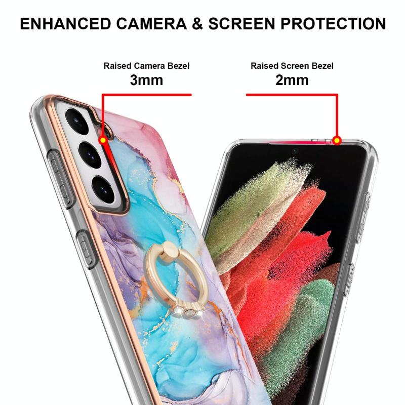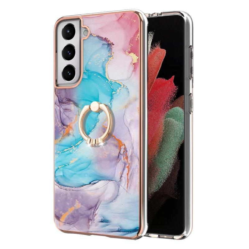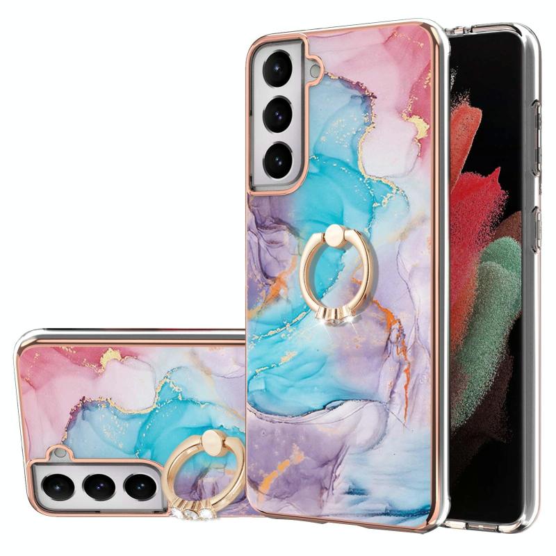 For Samsung Galaxy S21 5G Electroplating Pattern IMD TPU Shockproof Case with Rhinestone Ring Holder(Milky Way Blue Marble)