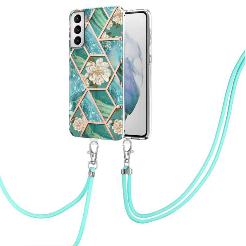 Θήκη για Samsung Galaxy S21 5G με ηλεκτρολυτική επιμετάλλωση, συνδυασμό μαρμάρου και λουλουδιών, από TPU με προστασία από κραδασμούς και λουρί (Ροζ Λουλούδι)