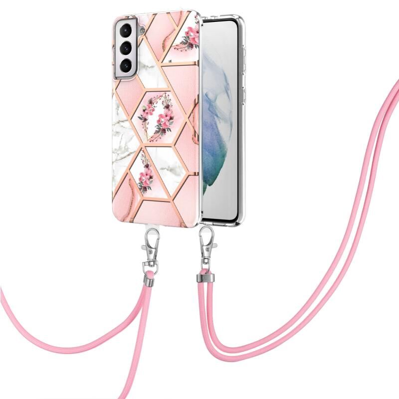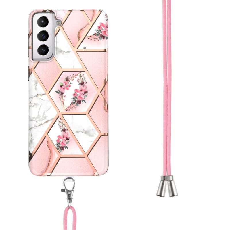 Θήκη για Samsung Galaxy S21 5G με ηλεκτρολυτική επιμετάλλωση, συνδυασμό μαρμάρου και λουλουδιών, από TPU με προστασία από κραδασμούς και λουρί (Ροζ Λουλούδι)