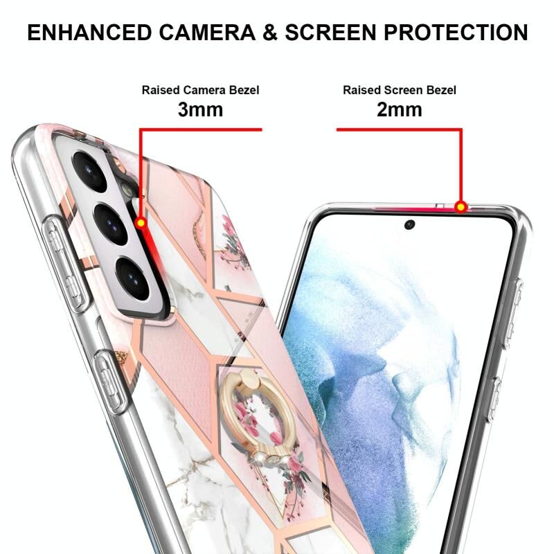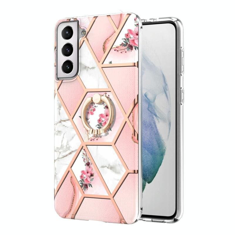 For Samsung Galaxy S21+ 5G Electroplating Splicing Marble Flower Pattern TPU Shockproof Case with Rhinestone Ring Holder(Pink Flower)