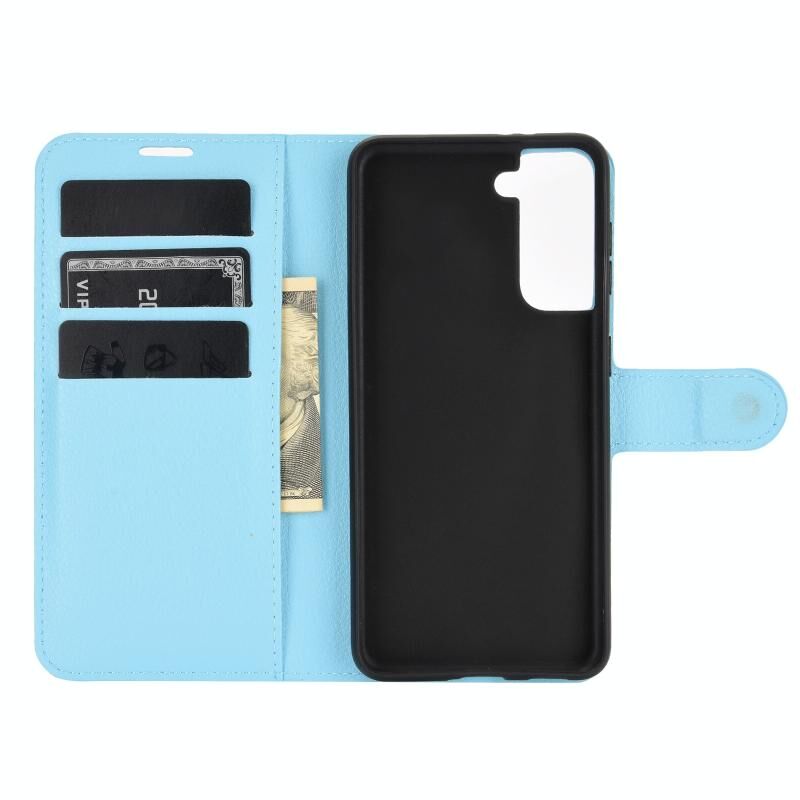 Προστατευτική θήκη τύπου βιβλιαρίου με υφή δέρματος λύτσι για Samsung Galaxy S21 5G με βάση στήριξης, υποδοχές καρτών και θήκη πορτοφολιού (Μπλε)