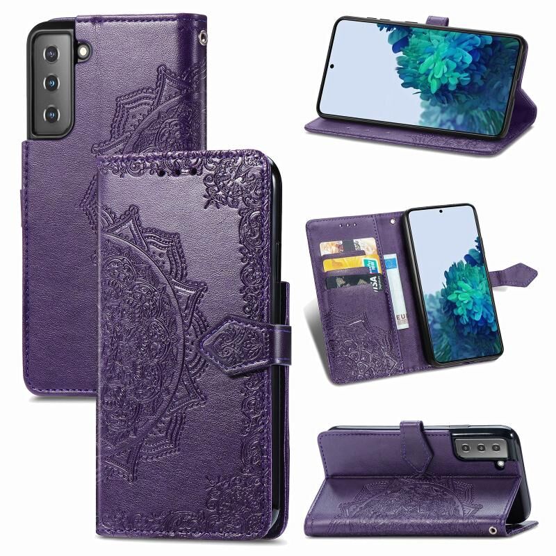 Θήκη Samsung Galaxy S21 5G, Δερμάτινη οριζόντια θήκη με σχέδιο Mandala, λουλούδι σε ανάγλυφο, με βάση & τρεις θήκες για κάρτες & πορτοφόλι & κορδόνι (Μπλε)