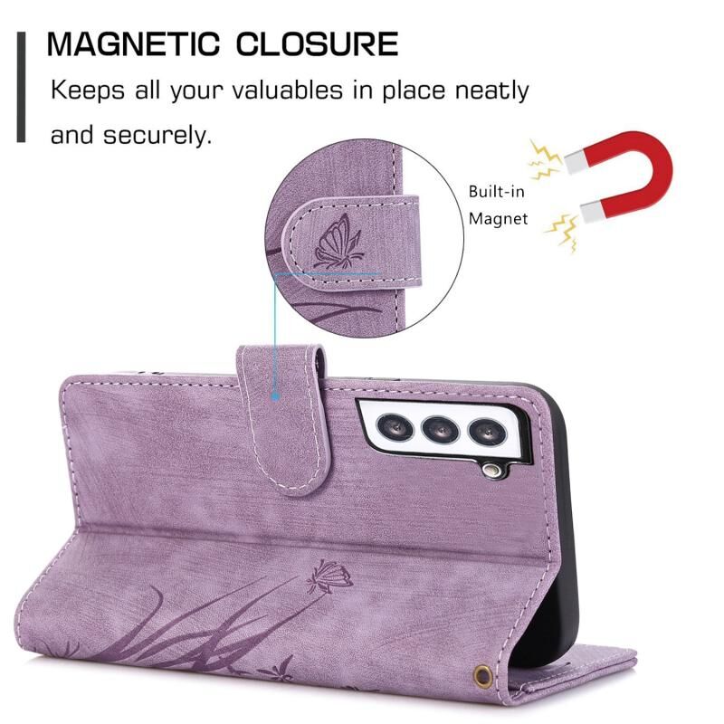 Θήκη τηλεφώνου Samsung Galaxy S21 5G από δέρμα με ανάγλυφο σχέδιο ορχιδέας πεταλούδας (Μωβ)