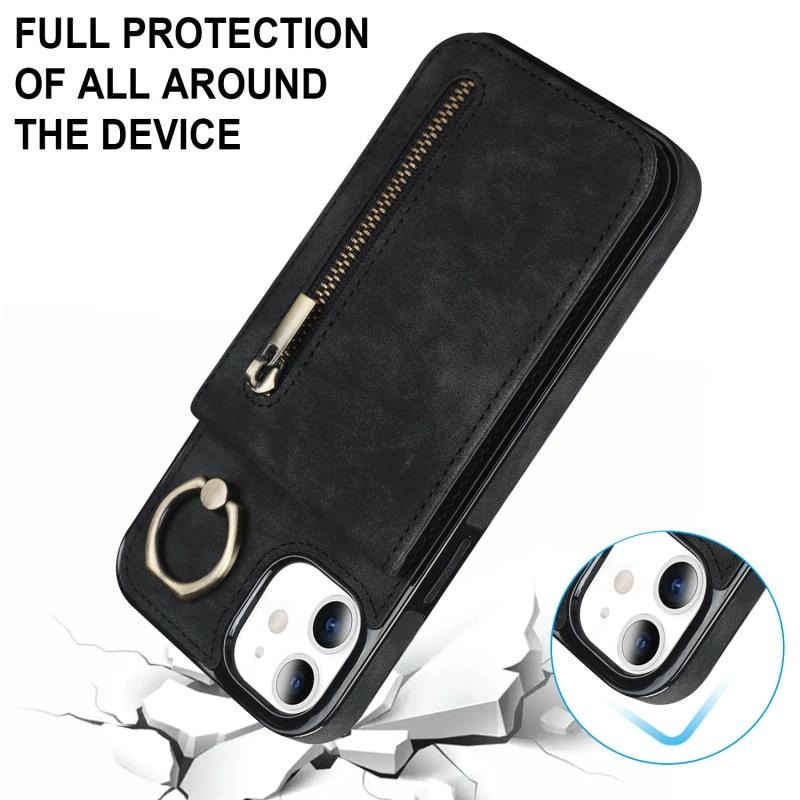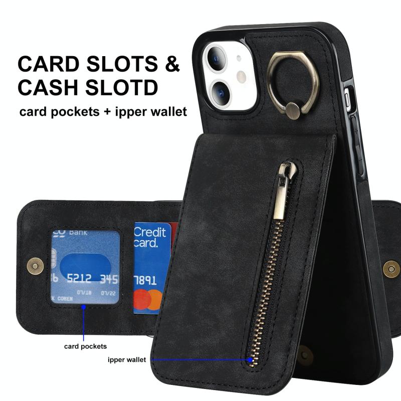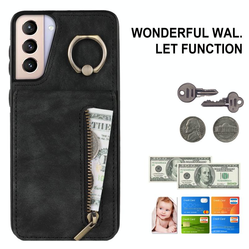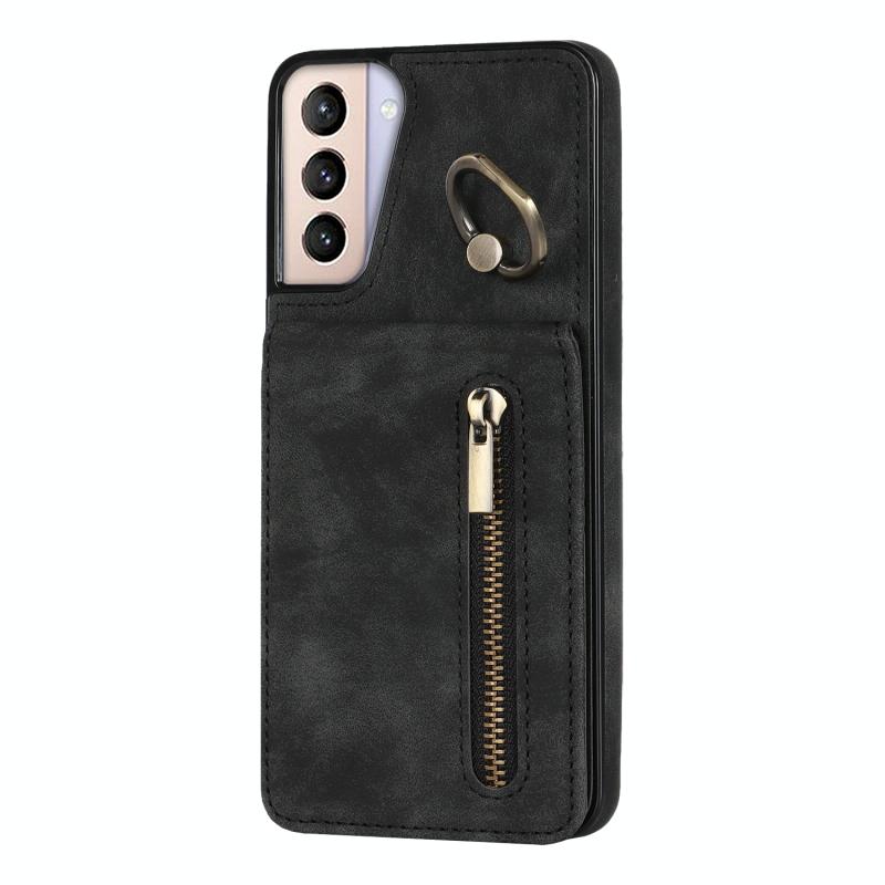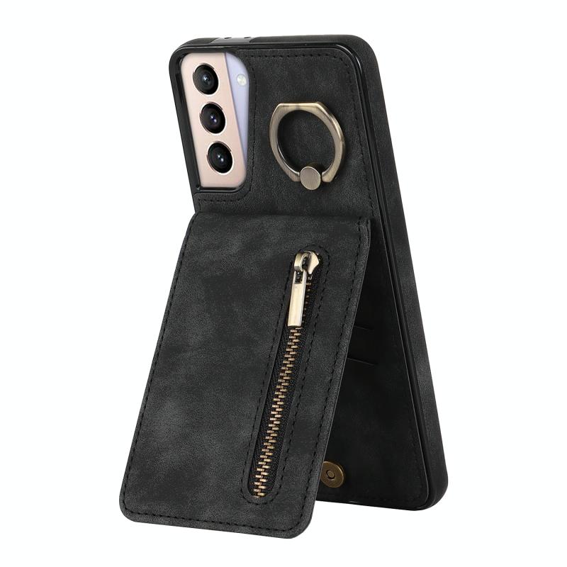 Θήκη κινητού τηλεφώνου Samsung Galaxy S21 5G με ρετρό δακτύλιο και θήκη καρτών RFID με φερμουάρ (Μαύρο)