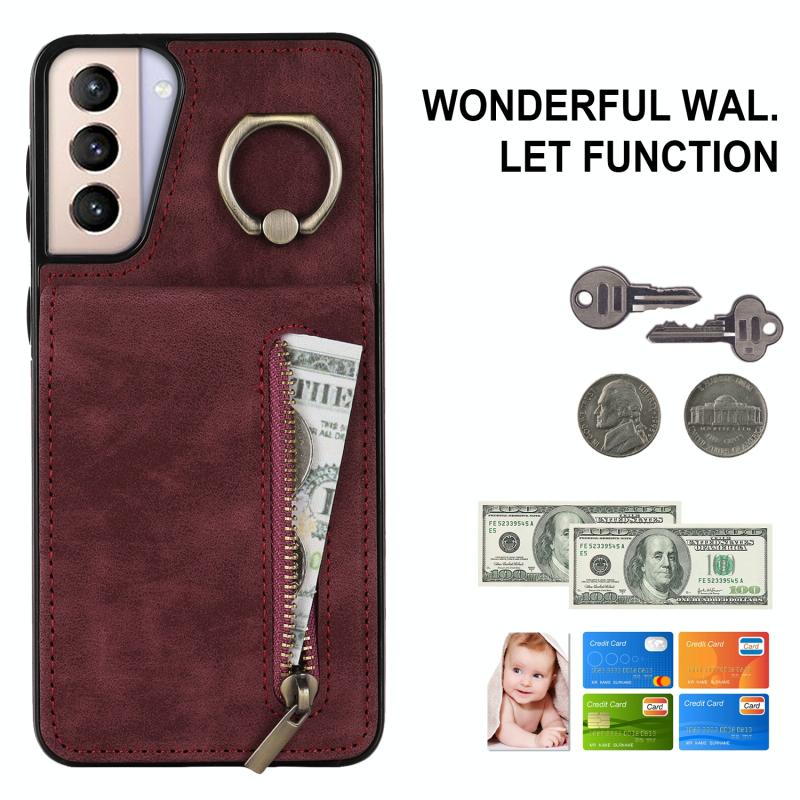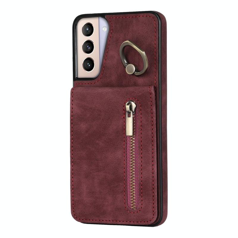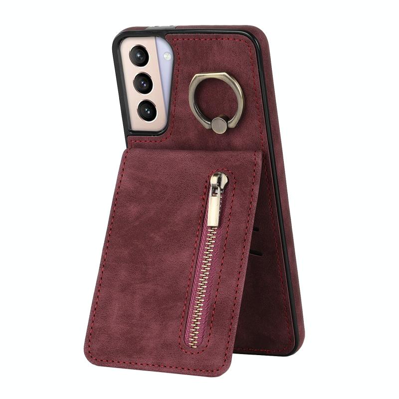 Θήκη κινητού τηλεφώνου Samsung Galaxy S21+ 5G με ρετρό δακτύλιο και θήκη καρτών RFID με φερμουάρ (Καφέ)