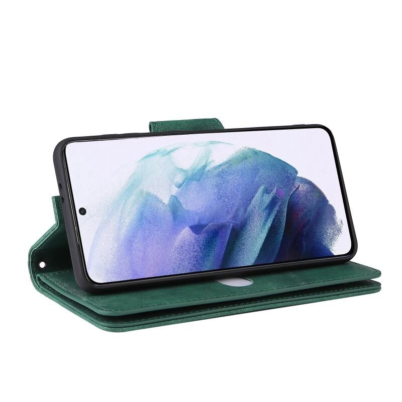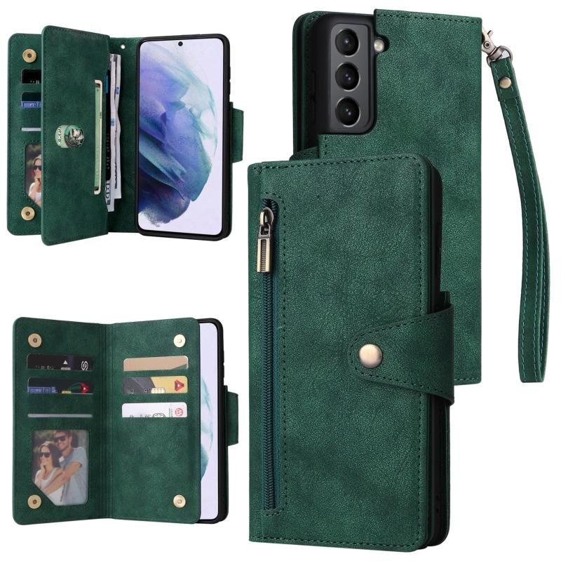 Για Samsung Galaxy S21 5G Rivet πόρπη 9 κάρτες τρεις φορές δερμάτινη θήκη τηλεφώνου (πράσινο)