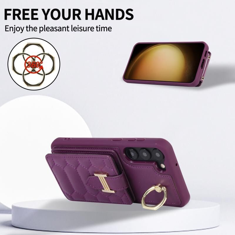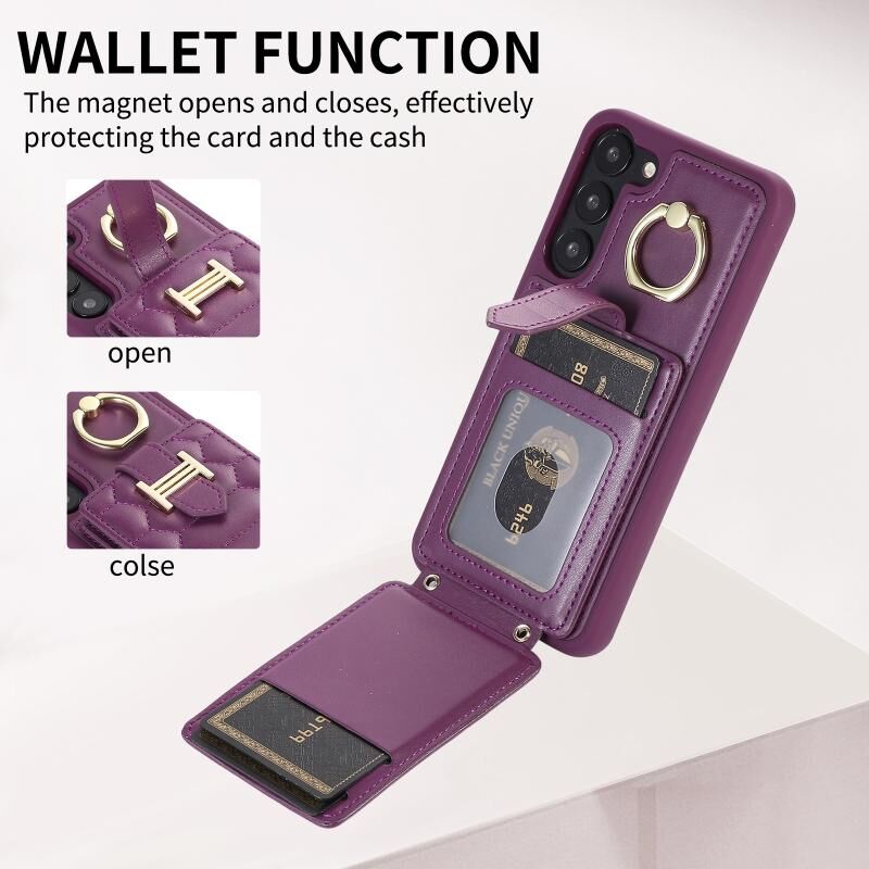 Για Samsung Galaxy S21 + 5G Κάθετη κάρτα τσάντα δαχτυλίδι κάτοχος υπόθεση τηλεφώνου με διπλό κορδόνι (σκούρο μωβ)