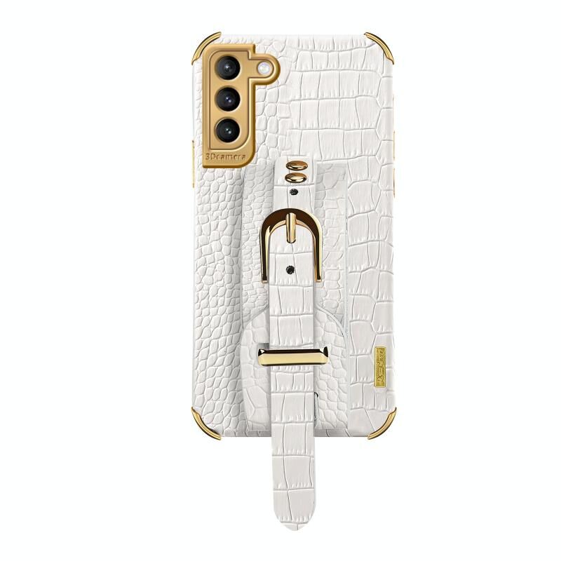 Για Samsung Galaxy S21 Electroplated TPU Crocodile Pattern Leather Case με λουράκι καρπού (Λευκό)