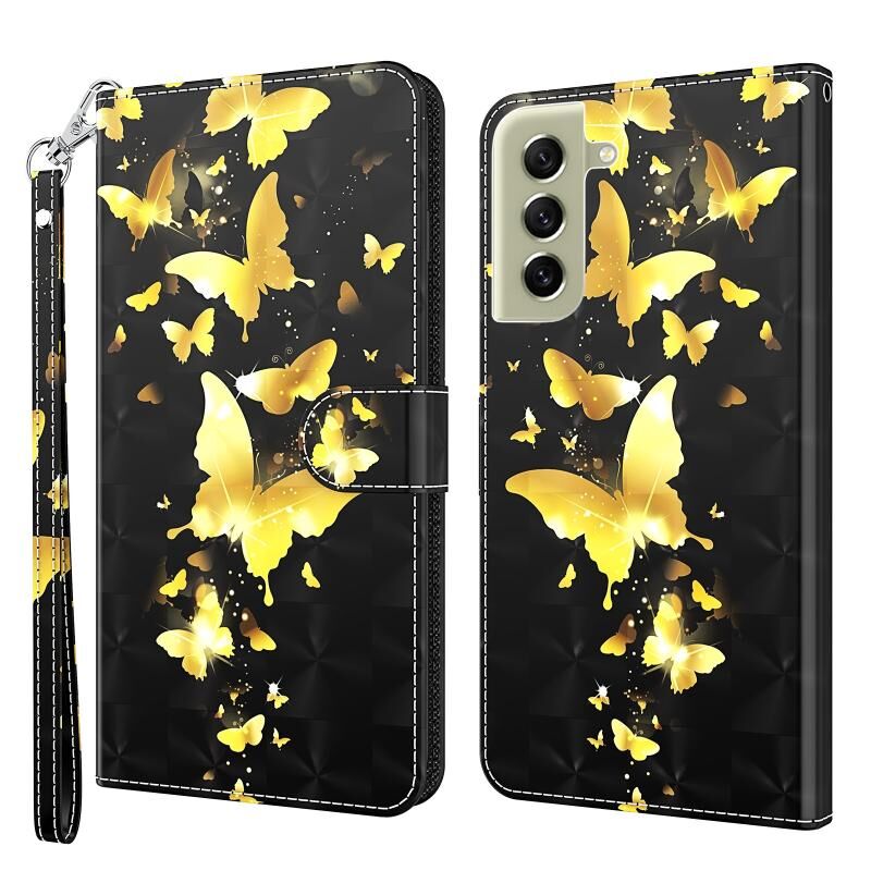Θήκη κινητού τηλεφώνου για Samsung Galaxy S21 FE 5G, TPU + Δερμάτινη PU με σχέδιο 3D ζωγραφικής (Χρυσή Πεταλούδα)