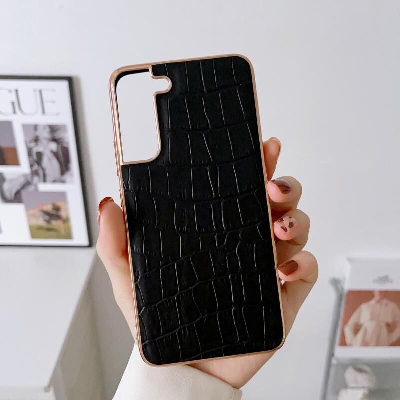 Θήκη τηλεφώνου Samsung Galaxy S21 FE 5G με γνήσιο δέρμα υφής κροκόδειλου και ηλεκτρολυτική επίστρωση (Μαύρο)