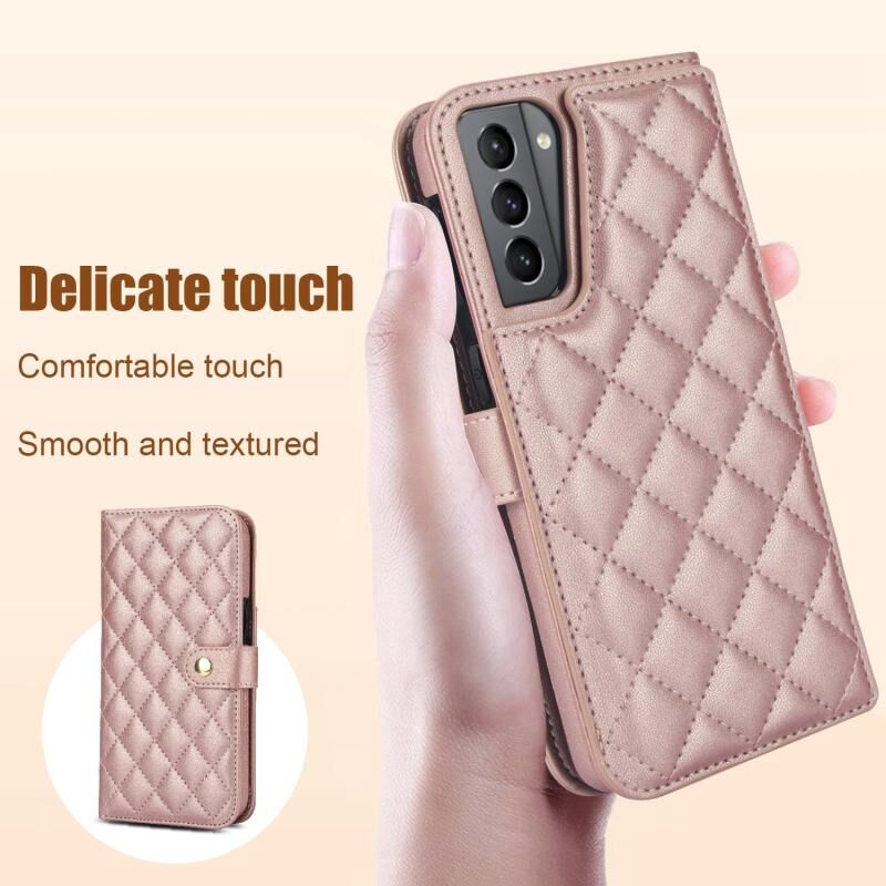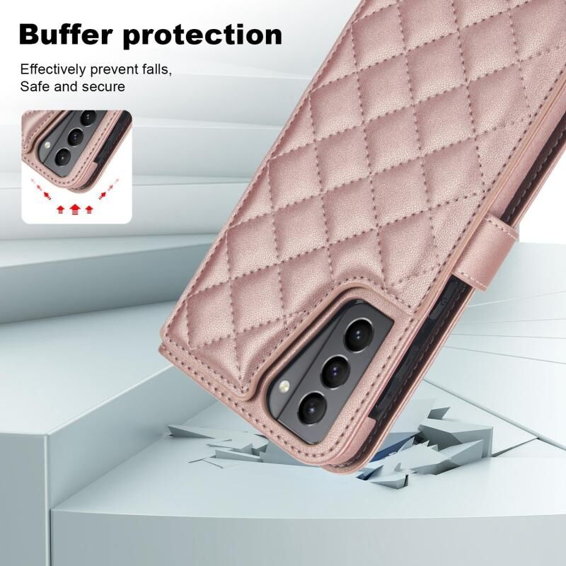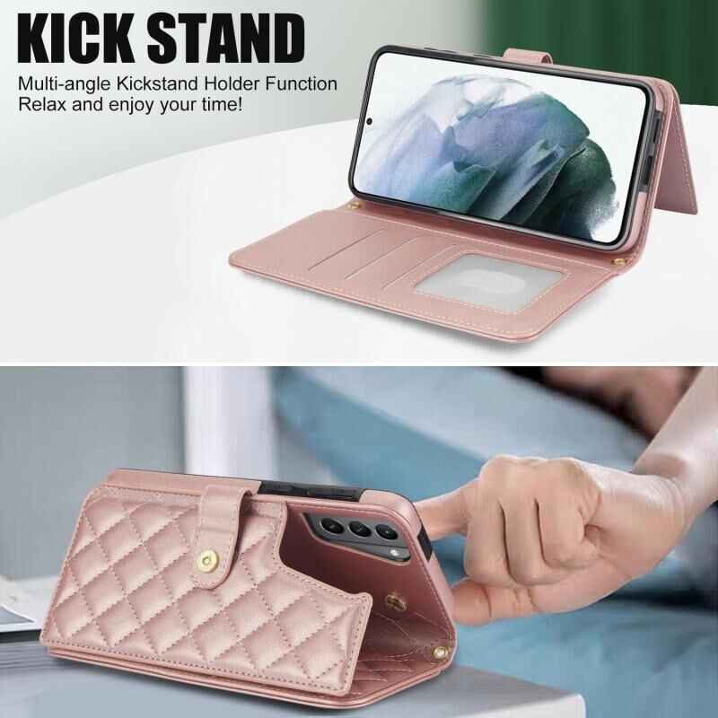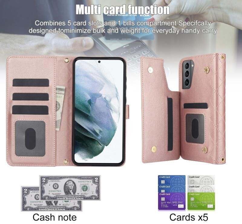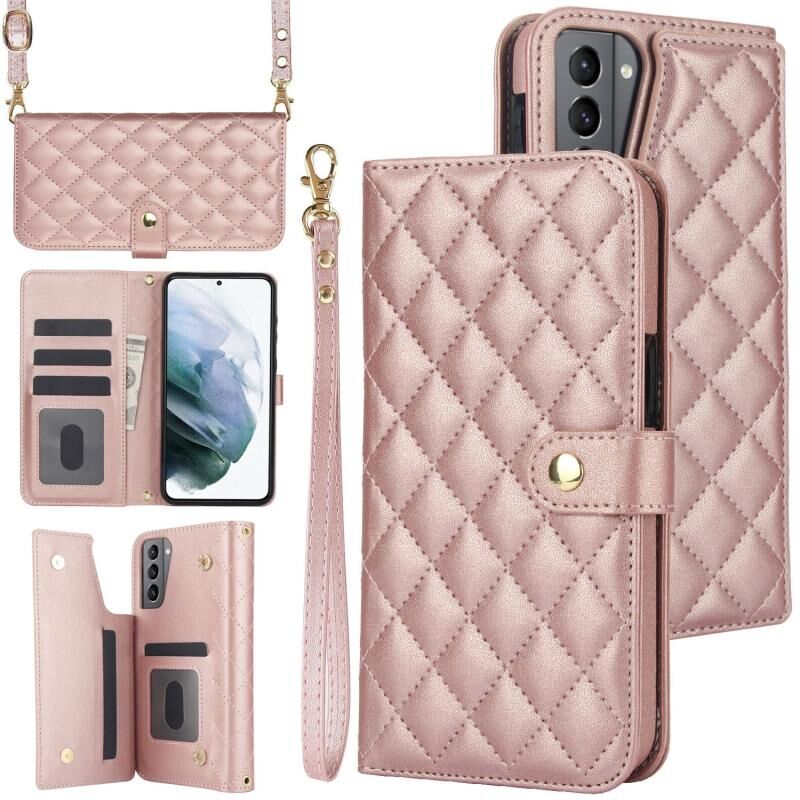 Για Samsung Galaxy S21 FE 5G Crossbody Πολυλειτουργική θήκη τηλεφώνου από δέρμα (ροζ χρυσό)