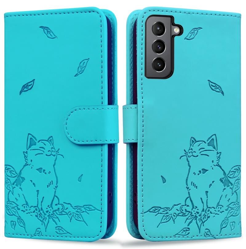Θήκη τηλεφώνου από δέρμα με ανάγλυφο χαριτωμένο γατάκι για Samsung Galaxy S21 FE 5G (Γαλάζια Λίμνη)