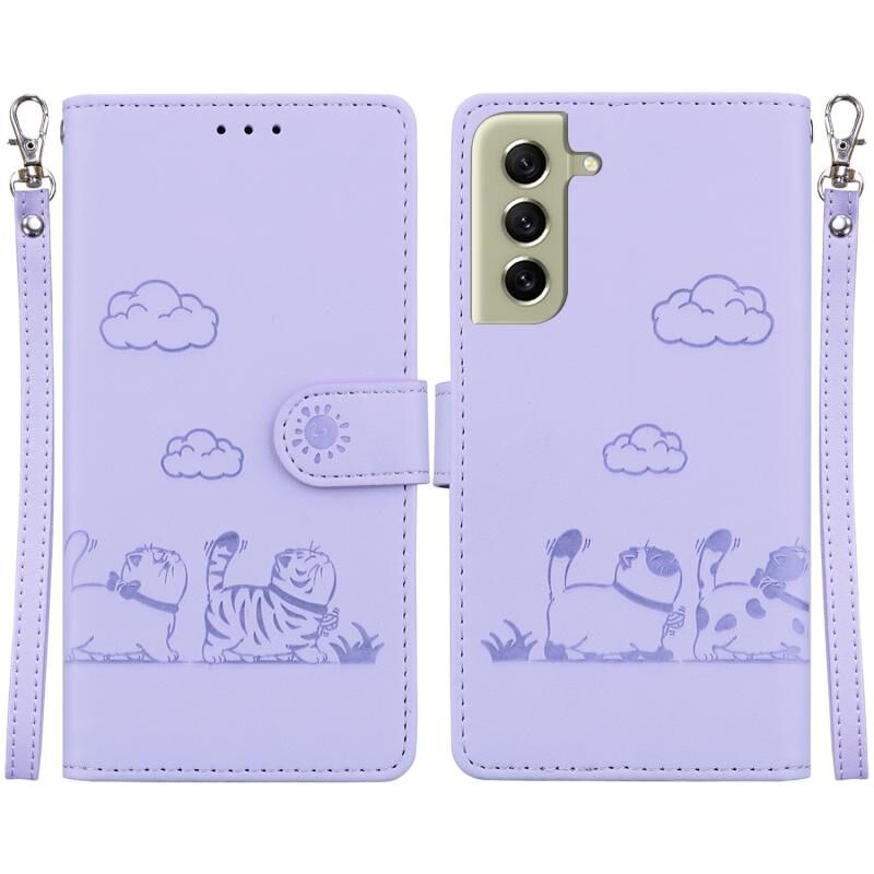 Θήκη τηλεφώνου Samsung Galaxy S21 FE 5G από δέρμα με χαριτωμένες γάτες και προστασία RFID (Μωβ)
