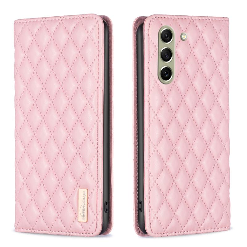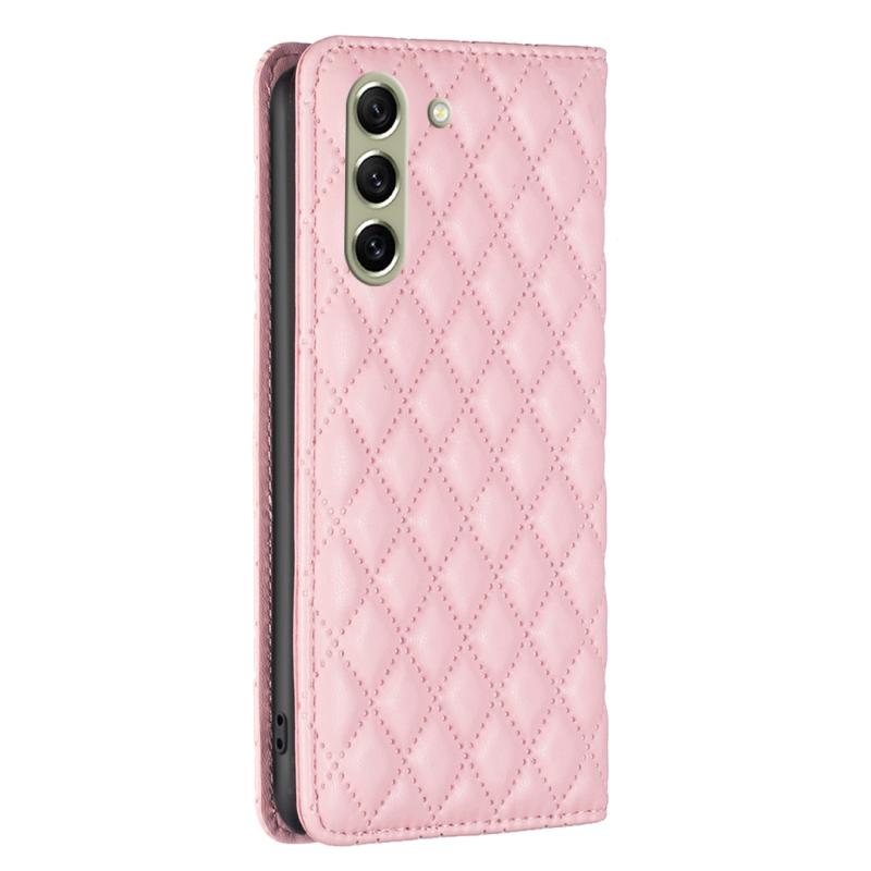 Θήκη τηλεφώνου Samsung Galaxy S21 FE 5G, Δερμάτινη, Πτυσσόμενη, Μαγνητική, με σχέδιο διαμαντόπλεγμα (ρόζ)
