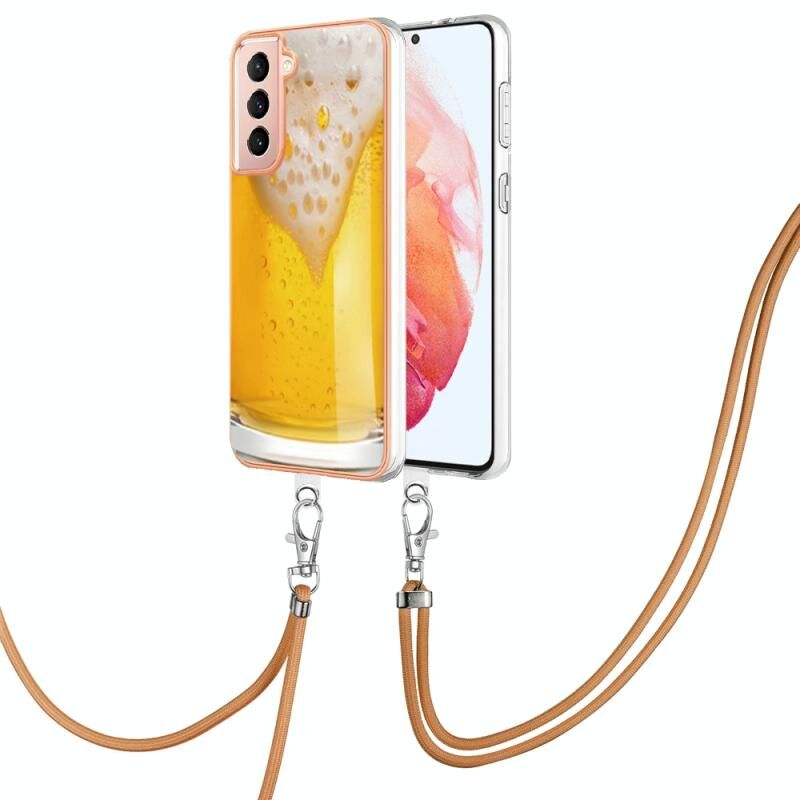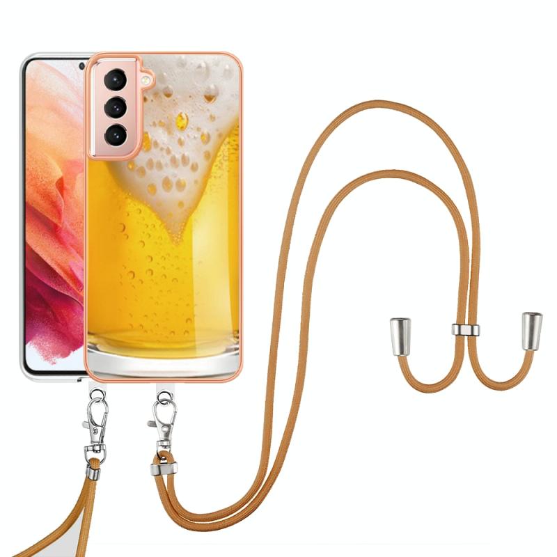 For Samsung Galaxy S21 FE 5G Electroplating Dual-side IMD Phone Case with Lanyard(Draft Beer)