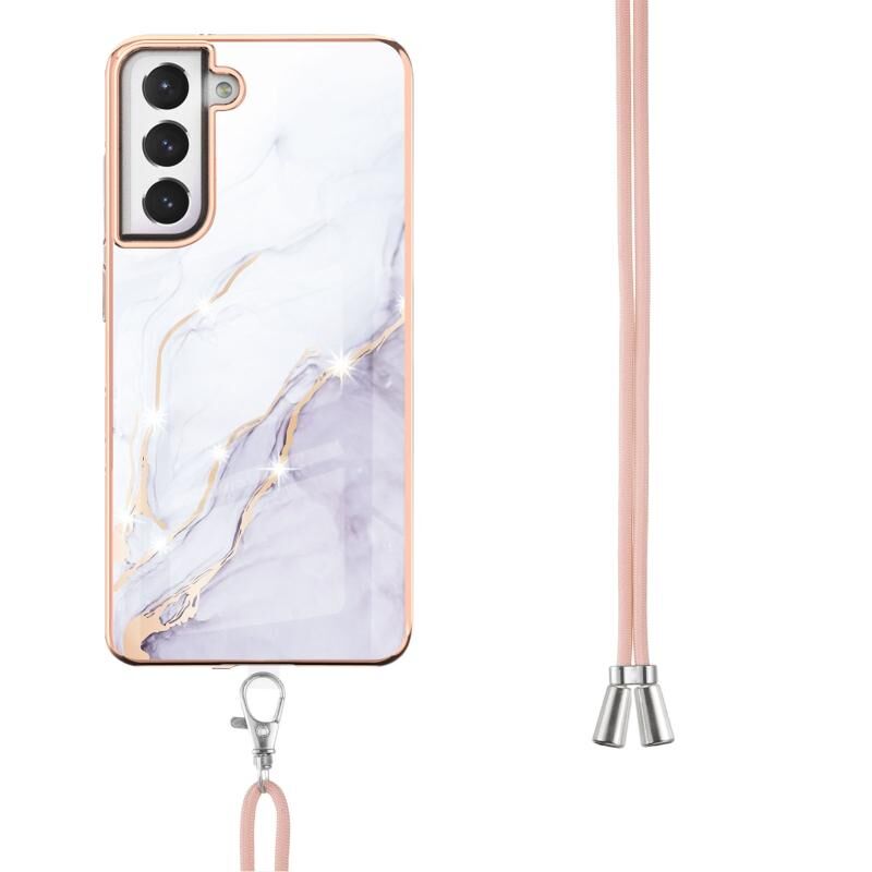Θήκη για Samsung Galaxy S21 FE 5G με Γαλβανισμένο Σχέδιο Μαρμάρου IMD TPU Αντικραδασμική με Λουρί Λαιμού (Λευκό 006)