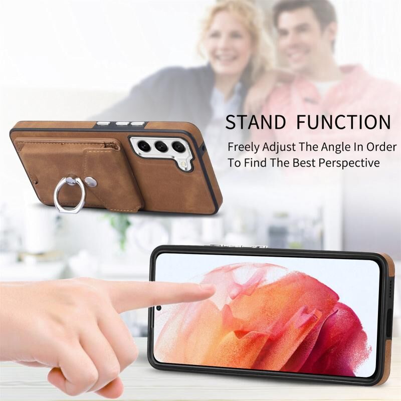 Για Samsung Galaxy S21 FE 5G Electroplating Skin-feel Δερμάτινο δαχτυλίδι κάρτα πορτοφόλι υπόθεση τηλεφώνου (καφέ)