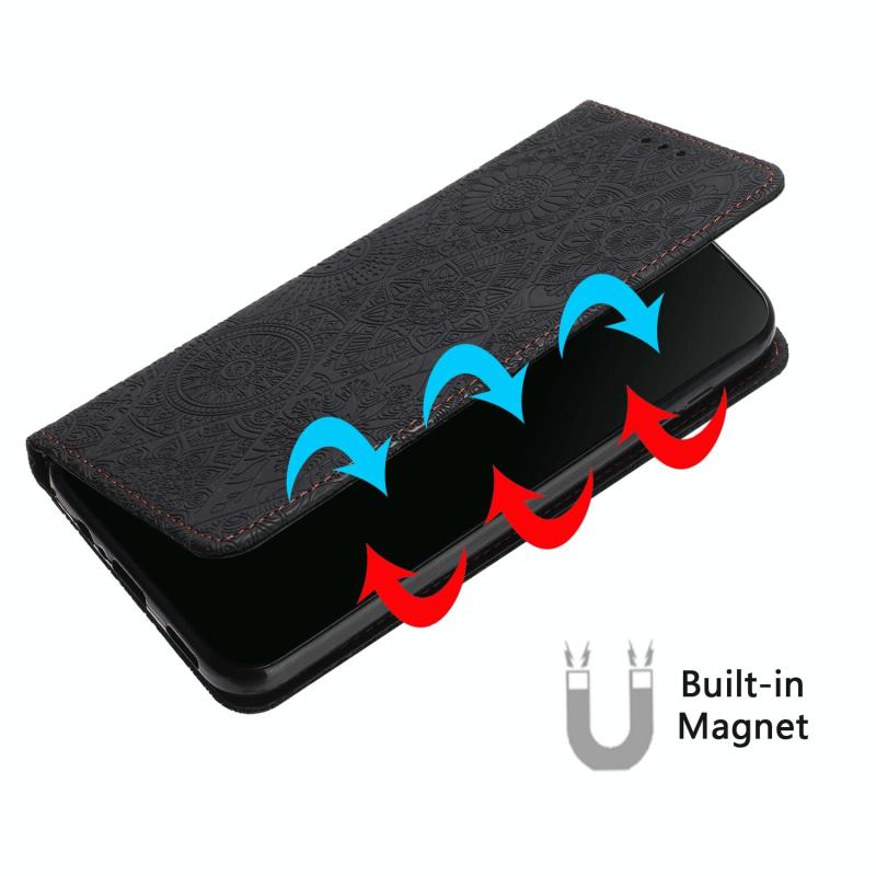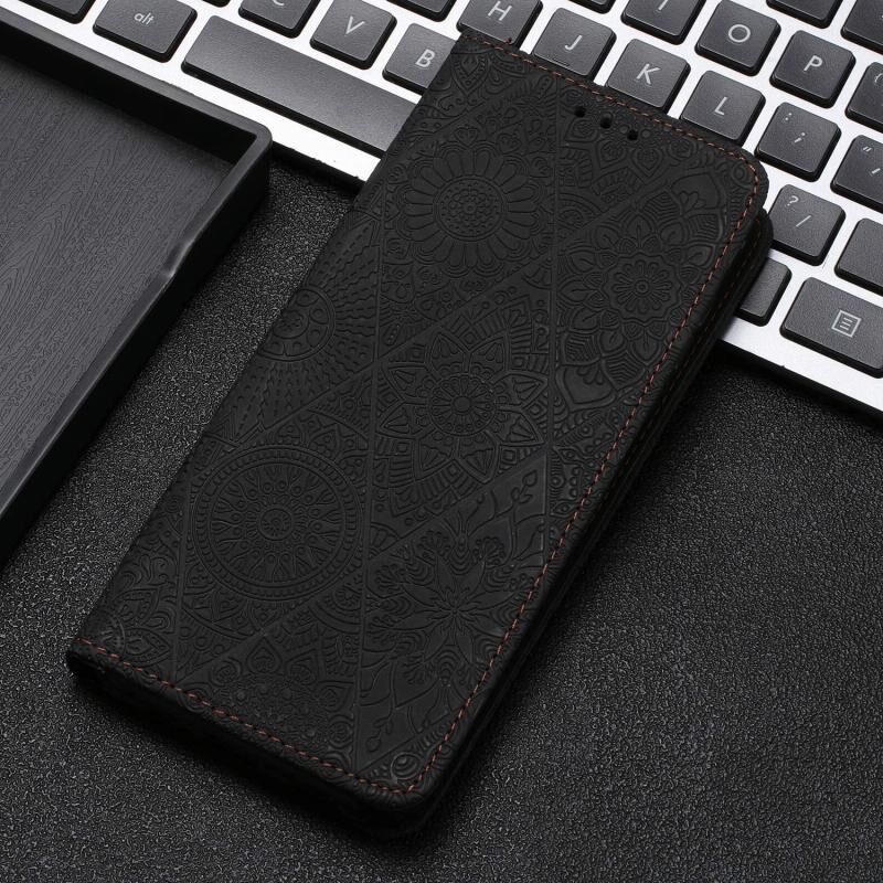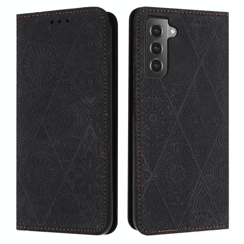 Θήκη τηλεφώνου Samsung Galaxy S21 FE 5G από δέρμα με έθνικ ανάγλυφο και απορρόφηση (Μαύρο)