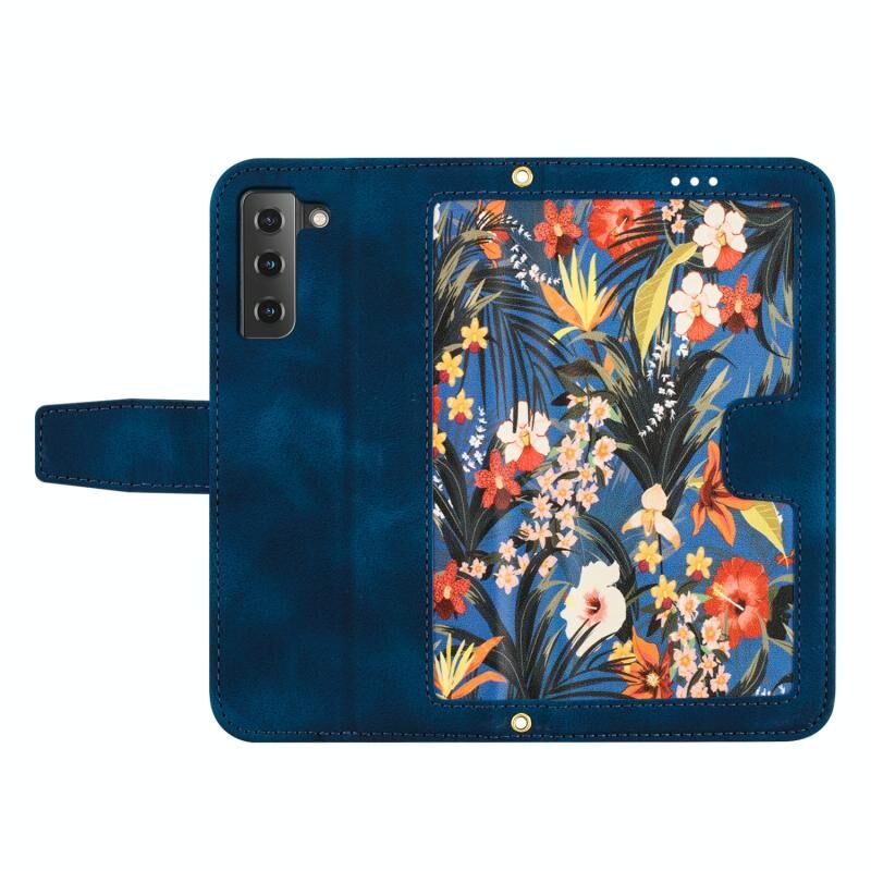 Θήκη τηλεφώνου Samsung Galaxy S21 FE 5G από δέρμα με λουλουδάτο σχέδιο και κορδόνι (Ανοιχτό Μπλε)