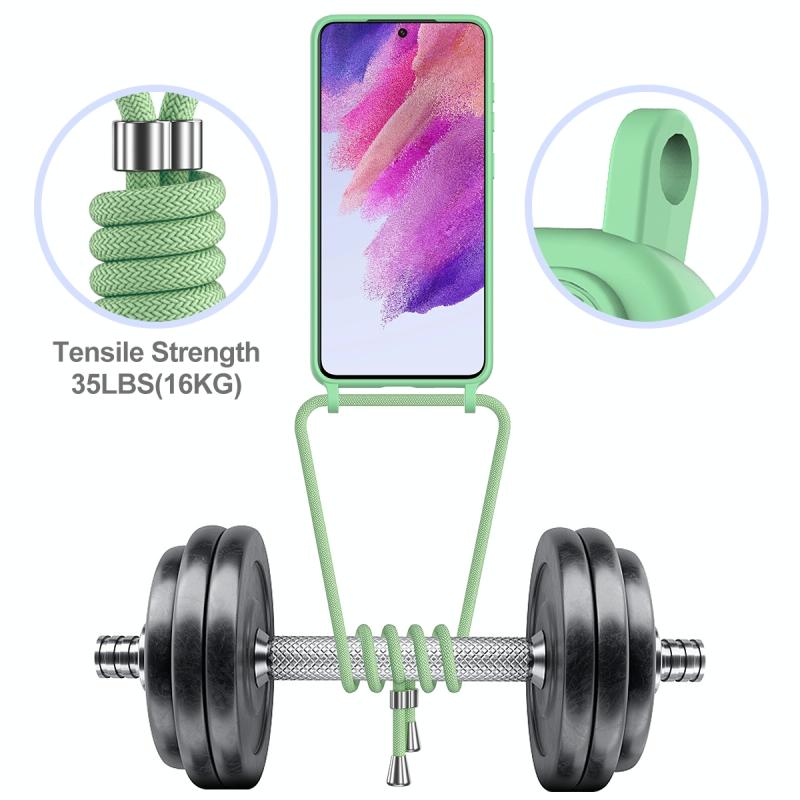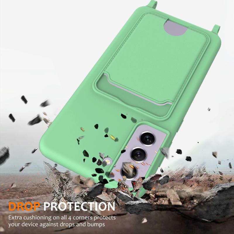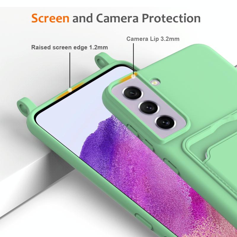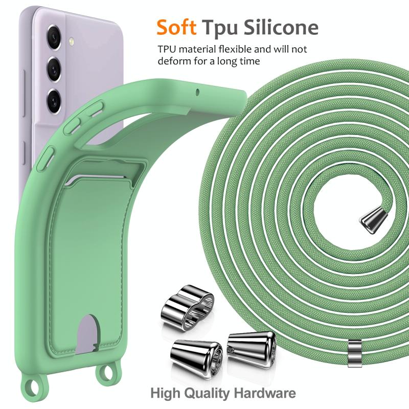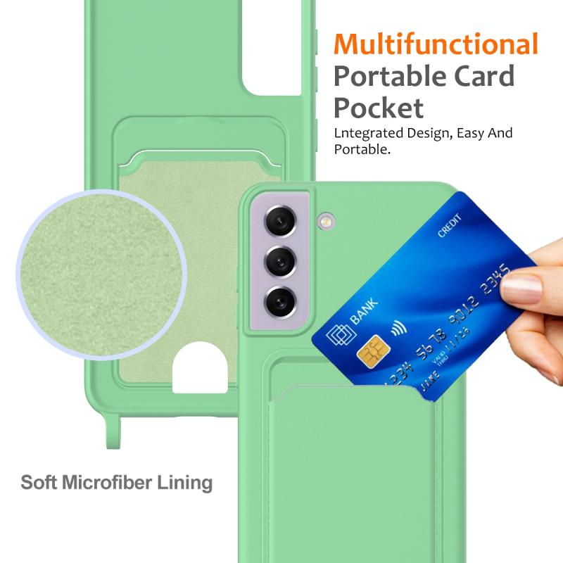 For Samsung Galaxy S21 FE 5G Integrated Card Bag Solid Color Liquid Silicone Phone Case with Lanyard(Green)