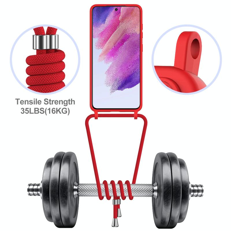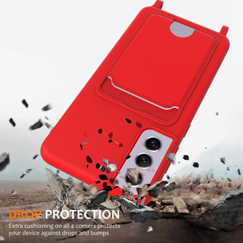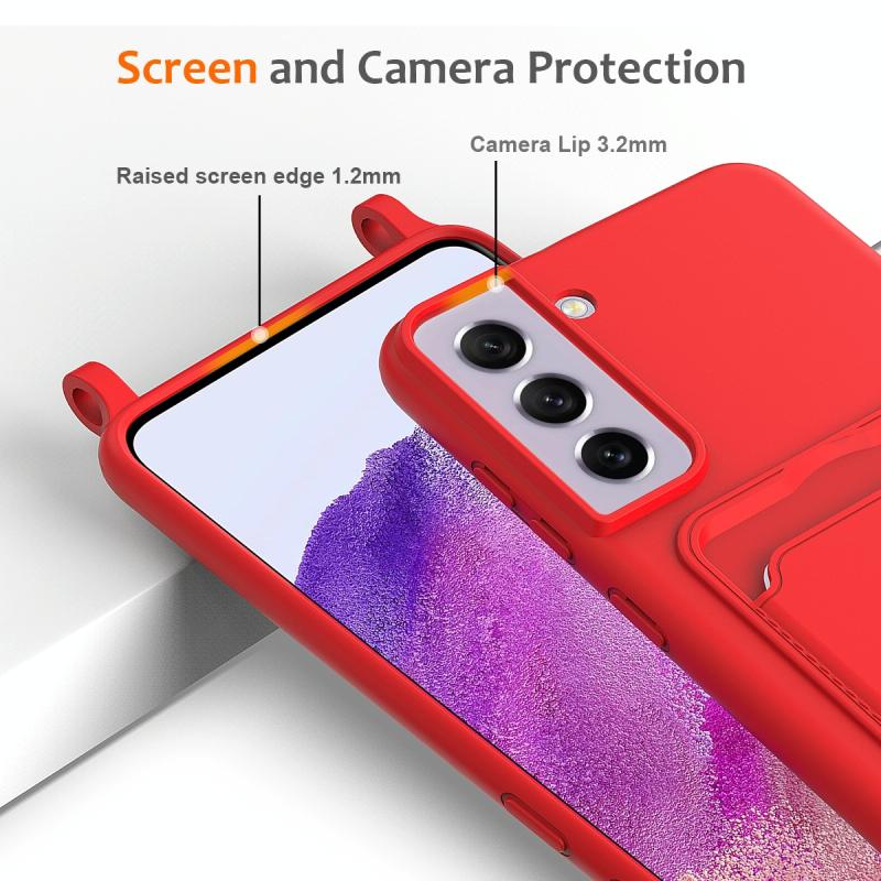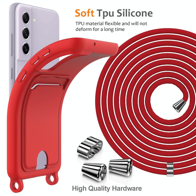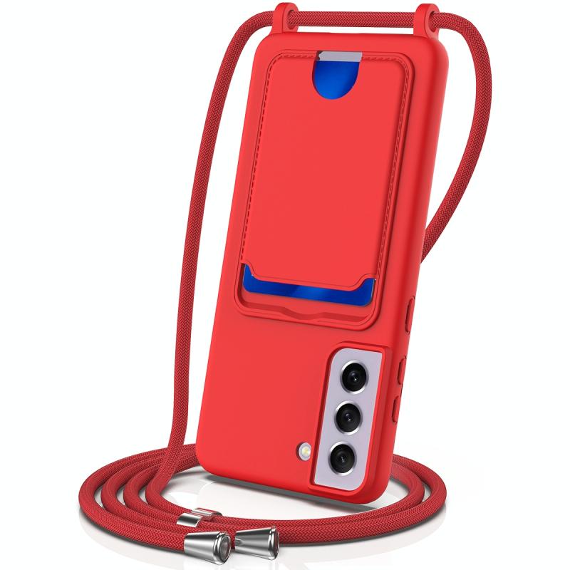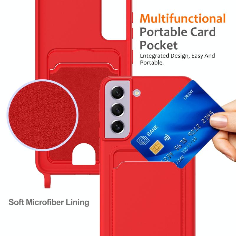 For Samsung Galaxy S21 FE 5G Integrated Card Bag Solid Color Liquid Silicone Phone Case with Lanyard(Red)