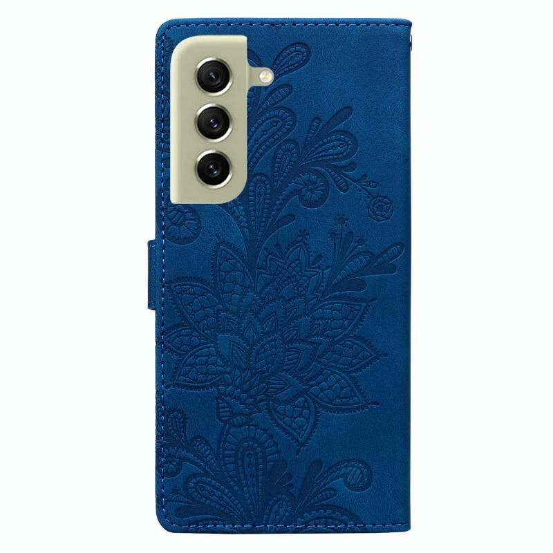 Θήκη τηλεφώνου Samsung Galaxy S21 FE 5G από PU με δαντελένιο λουλουδάτο ανάγλυφο και μαγνητικό κούμπωμα, με λουρί καρπού (Μωβ)