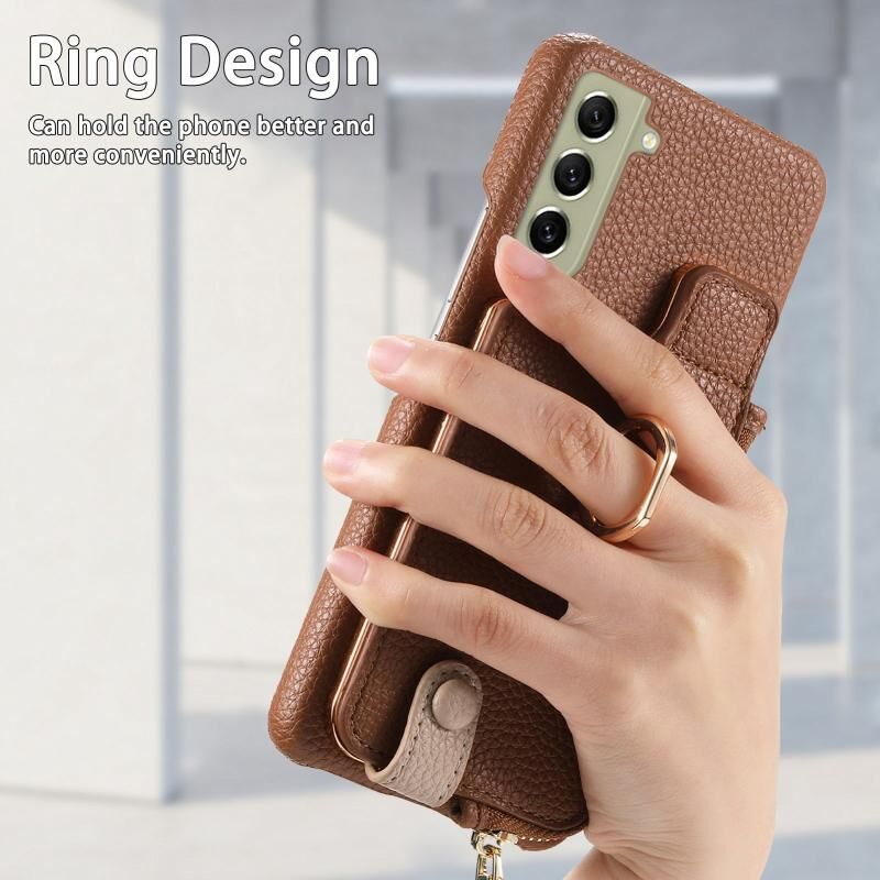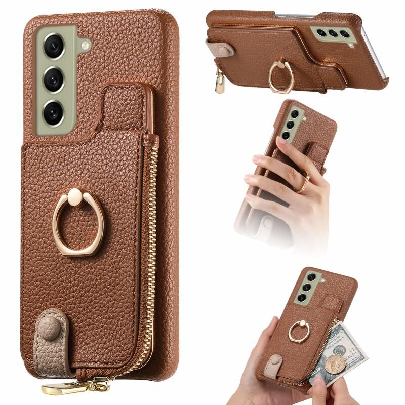 Για Samsung Galaxy S21 FE 5G Litchi δέρμα λάδι Edge δαχτυλίδι φερμουάρ πορτοφόλι πίσω θήκη τηλεφώνου (καφέ)