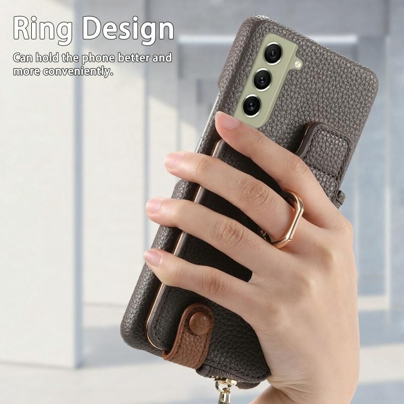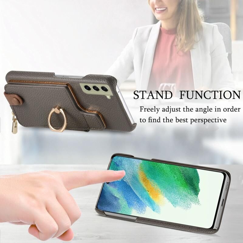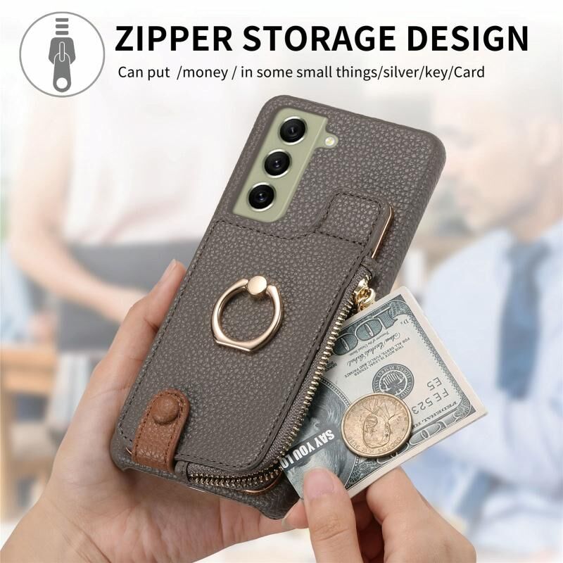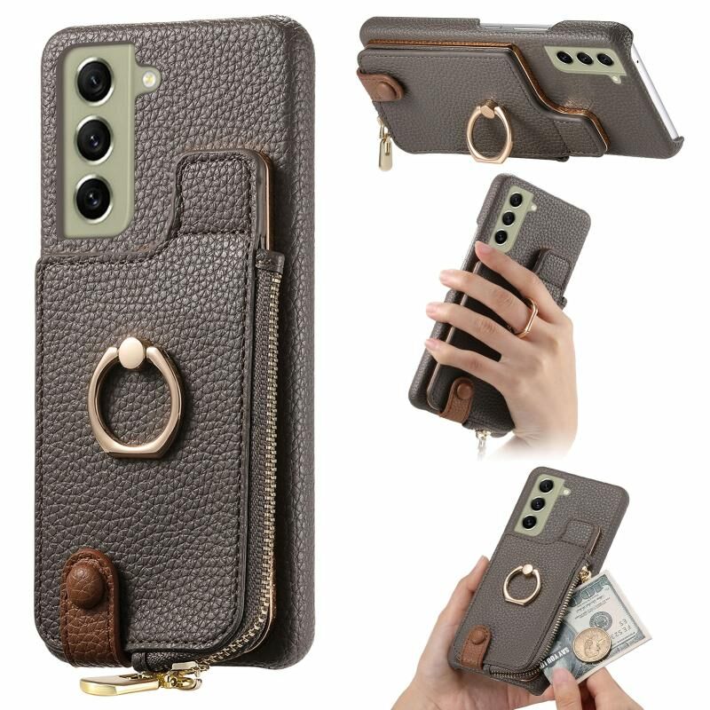 Για Samsung Galaxy S21 FE 5G Litchi δέρμα λάδι Edge δαχτυλίδι φερμουάρ πορτοφόλι πίσω θήκη τηλεφώνου (γκρι)