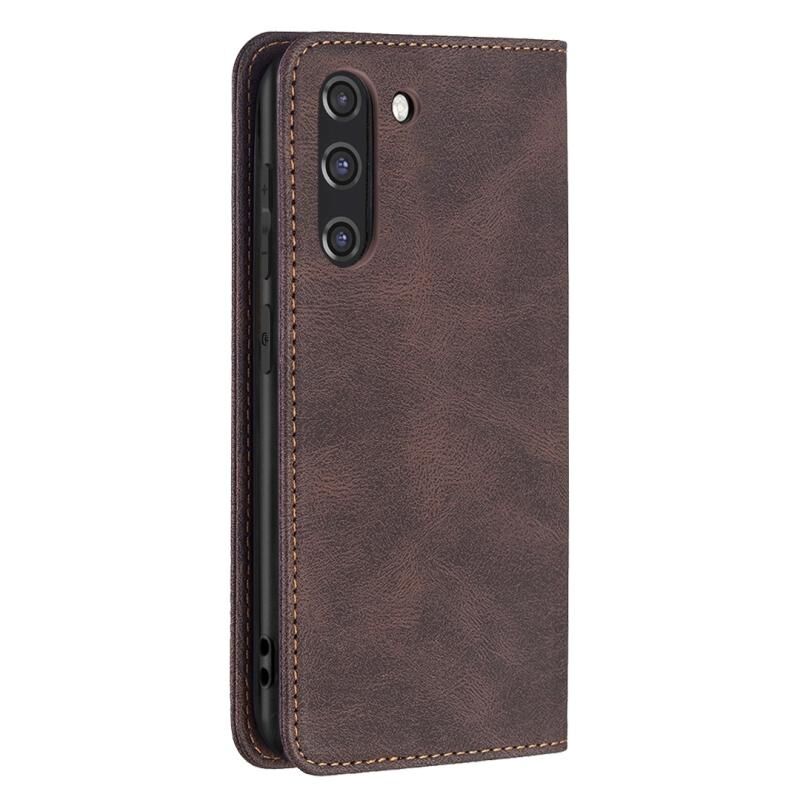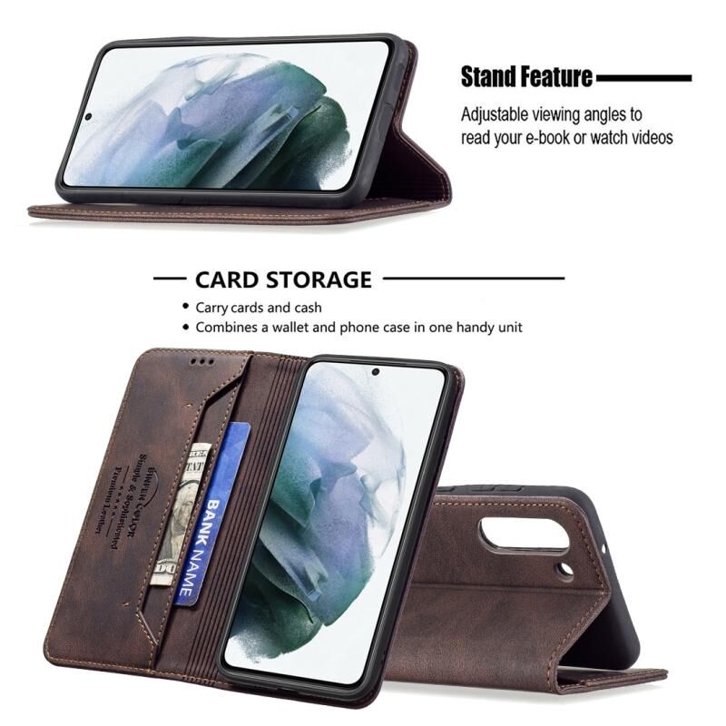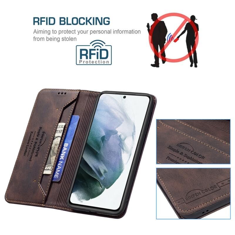 Για Samsung Galaxy S21 FE 5G Μαγνητικό RFID Blocking Anti-Theft Δερμάτινη θήκη με θήκη & υποδοχές για κάρτες & πορτοφόλι (καφέ)