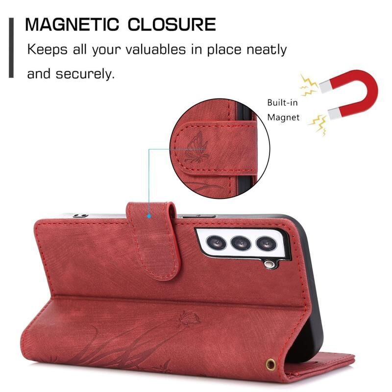 Θήκη τηλεφώνου Samsung Galaxy S21 FE 5G από δέρμα με ανάγλυφο σχέδιο ορχιδέας πεταλούδας (Μαύρο)