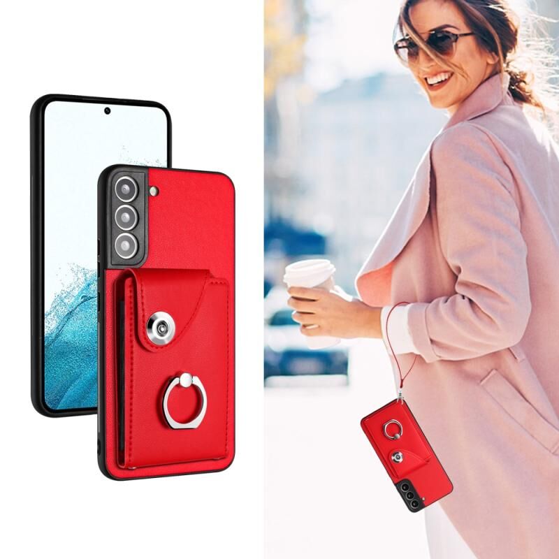 Για Samsung Galaxy S21 FE 5G Οργανική κάρτα τσάντα δακτύλιος κάτοχος PU θήκη τηλεφώνου με κορδόνι (κόκκινο)